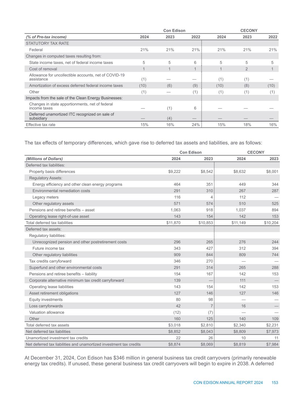 Con Edison CECONY (% of Pre-tax income) 2024 2023 2022 2024 2023 2022 STATUTORY TAX RATE Federal 21% 21% 21% 21% 21% 21% Changes in computed taxes resulting from: State income taxes, net of federal income taxes 5 5 6 5 5 5 Cost of removal 1 1 1 1 2 1 Allowance for uncollectible accounts, net of COVID-19 assistance (1) — — (1) (1) — Amortization of excess deferred federal income taxes (10) (6) (9) (10) (8) (10) Other (1) — (1) (1) (1) (1) Impacts from the sale of the Clean Energy Businesses: Changes in state apportionments, net of federal income taxes — (1) 6 — — — Deferred unamortized ITC recognized on sale of subsidiary — (4) — — — — Effective tax rate 15% 16% 24% 15% 18% 16% The tax effects of temporary differences, which gave rise to deferred tax assets and liabilities, are as follows: Con Edison CECONY (Millions of Dollars) 2024 2023 2024 2023 Deferred tax liabilities: Property basis differences $9,222 $8,542 $8,632 $8,001 Regulatory Assets: Energy efficiency and other clean energy programs 464 351 449 344 Environmental remediation costs 291 310 267 287 Legacy meters 116 4 112 — Other regulatory assets 571 574 510 525 Pensions and retiree benefits – asset 1,063 918 1,037 894 Operating lease right-of-use asset 143 154 142 153 Total deferred tax liabilities $11,870 $10,853 $11,149 $10,204 Deferred tax assets: Regulatory liabilities: Unrecognized pension and other postretirement costs 296 265 276 244 Future income tax 343 427 312 394 Other regulatory liabilities 909 844 809 744 Tax credits carryforward 346 270 — — Superfund and other environmental costs 291 314 265 288 Pensions and retiree benefits – liability 154 167 142 153 Corporate alternative minimum tax credit carryforward 139 — 111 — Operating lease liabilities 143 154 142 153 Asset retirement obligations 127 146 127 146 Equity investments 80 98 — — Loss carryforwards 42 7 16 — Valuation allowance (12) (7) — — Other 160 125 140 109 Total deferred tax assets $3,018 $2,810 $2,340 $2,231 Net deferred tax liabilities $8,852 $8,043 $8,809 $7,973 Unamortized investment tax credits 22 26 10 11 Net deferred tax liabilities and unamortized investment tax credits $8,874 $8,069 $8,819 $7,984 At December 31, 2024, Con Edison has $346 million in general business tax credit carryovers (primarily renewable energy tax credits). If unused, these general business tax credit carryovers will begin to expire in 2038. A deferred CON EDISON ANNUAL REPORT 2024 153