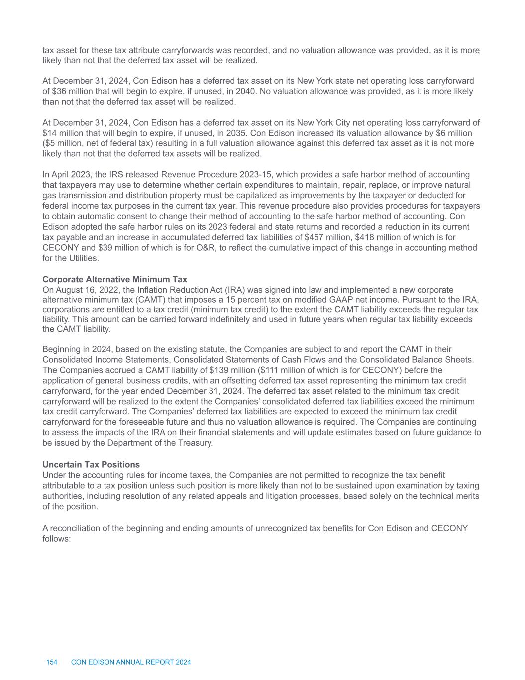 tax asset for these tax attribute carryforwards was recorded, and no valuation allowance was provided, as it is more likely than not that the deferred tax asset will be realized. At December 31, 2024, Con Edison has a deferred tax asset on its New York state net operating loss carryforward of $36 million that will begin to expire, if unused, in 2040. No valuation allowance was provided, as it is more likely than not that the deferred tax asset will be realized. At December 31, 2024, Con Edison has a deferred tax asset on its New York City net operating loss carryforward of $14 million that will begin to expire, if unused, in 2035. Con Edison increased its valuation allowance by $6 million ($5 million, net of federal tax) resulting in a full valuation allowance against this deferred tax asset as it is not more likely than not that the deferred tax assets will be realized. In April 2023, the IRS released Revenue Procedure 2023-15, which provides a safe harbor method of accounting that taxpayers may use to determine whether certain expenditures to maintain, repair, replace, or improve natural gas transmission and distribution property must be capitalized as improvements by the taxpayer or deducted for federal income tax purposes in the current tax year. This revenue procedure also provides procedures for taxpayers to obtain automatic consent to change their method of accounting to the safe harbor method of accounting. Con Edison adopted the safe harbor rules on its 2023 federal and state returns and recorded a reduction in its current tax payable and an increase in accumulated deferred tax liabilities of $457 million, $418 million of which is for CECONY and $39 million of which is for O&R, to reflect the cumulative impact of this change in accounting method for the Utilities. Corporate Alternative Minimum Tax On August 16, 2022, the Inflation Reduction Act (IRA) was signed into law and implemented a new corporate alternative minimum tax (CAMT) that imposes a 15 percent tax on modified GAAP net income. Pursuant to the IRA, corporations are entitled to a tax credit (minimum tax credit) to the extent the CAMT liability exceeds the regular tax liability. This amount can be carried forward indefinitely and used in future years when regular tax liability exceeds the CAMT liability. Beginning in 2024, based on the existing statute, the Companies are subject to and report the CAMT in their Consolidated Income Statements, Consolidated Statements of Cash Flows and the Consolidated Balance Sheets. The Companies accrued a CAMT liability of $139 million ($111 million of which is for CECONY) before the application of general business credits, with an offsetting deferred tax asset representing the minimum tax credit carryforward, for the year ended December 31, 2024. The deferred tax asset related to the minimum tax credit carryforward will be realized to the extent the Companies’ consolidated deferred tax liabilities exceed the minimum tax credit carryforward. The Companies’ deferred tax liabilities are expected to exceed the minimum tax credit carryforward for the foreseeable future and thus no valuation allowance is required. The Companies are continuing to assess the impacts of the IRA on their financial statements and will update estimates based on future guidance to be issued by the Department of the Treasury. Uncertain Tax Positions Under the accounting rules for income taxes, the Companies are not permitted to recognize the tax benefit attributable to a tax position unless such position is more likely than not to be sustained upon examination by taxing authorities, including resolution of any related appeals and litigation processes, based solely on the technical merits of the position. A reconciliation of the beginning and ending amounts of unrecognized tax benefits for Con Edison and CECONY follows: 154 CON EDISON ANNUAL REPORT 2024