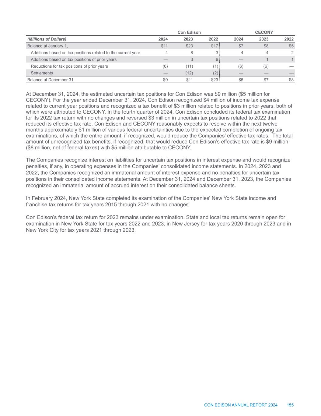 Con Edison CECONY (Millions of Dollars) 2024 2023 2022 2024 2023 2022 Balance at January 1, $11 $23 $17 $7 $8 $5 Additions based on tax positions related to the current year 4 8 3 4 4 2 Additions based on tax positions of prior years — 3 6 — 1 1 Reductions for tax positions of prior years (6) (11) (1) (6) (6) — Settlements — (12) (2) — — — Balance at December 31, $9 $11 $23 $5 $7 $8 At December 31, 2024, the estimated uncertain tax positions for Con Edison was $9 million ($5 million for CECONY). For the year ended December 31, 2024, Con Edison recognized $4 million of income tax expense related to current year positions and recognized a tax benefit of $3 million related to positions in prior years, both of which were attributed to CECONY. In the fourth quarter of 2024, Con Edison concluded its federal tax examination for its 2022 tax return with no changes and reversed $3 million in uncertain tax positions related to 2022 that reduced its effective tax rate. Con Edison and CECONY reasonably expects to resolve within the next twelve months approximately $1 million of various federal uncertainties due to the expected completion of ongoing tax examinations, of which the entire amount, if recognized, would reduce the Companies’ effective tax rates. The total amount of unrecognized tax benefits, if recognized, that would reduce Con Edison’s effective tax rate is $9 million ($8 million, net of federal taxes) with $5 million attributable to CECONY. The Companies recognize interest on liabilities for uncertain tax positions in interest expense and would recognize penalties, if any, in operating expenses in the Companies’ consolidated income statements. In 2024, 2023 and 2022, the Companies recognized an immaterial amount of interest expense and no penalties for uncertain tax positions in their consolidated income statements. At December 31, 2024 and December 31, 2023, the Companies recognized an immaterial amount of accrued interest on their consolidated balance sheets. In February 2024, New York State completed its examination of the Companies' New York State income and franchise tax returns for tax years 2015 through 2021 with no changes. Con Edison’s federal tax return for 2023 remains under examination. State and local tax returns remain open for examination in New York State for tax years 2022 and 2023, in New Jersey for tax years 2020 through 2023 and in New York City for tax years 2021 through 2023. CON EDISON ANNUAL REPORT 2024 155