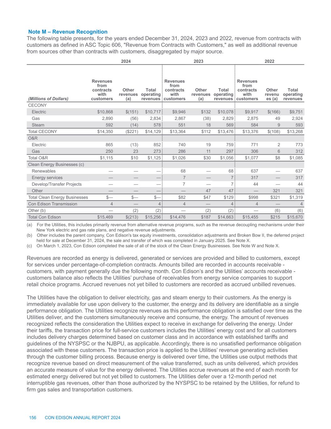 Note M – Revenue Recognition The following table presents, for the years ended December 31, 2024, 2023 and 2022, revenue from contracts with customers as defined in ASC Topic 606, "Revenue from Contracts with Customers," as well as additional revenue from sources other than contracts with customers, disaggregated by major source. 2024 2023 2022 (Millions of Dollars) Revenues from contracts with customers Other revenues (a) Total operating revenues Revenues from contracts with customers Other revenues (a) Total operating revenues Revenues from contracts with customers Other revenu es (a) Total operating revenues CECONY Electric $10,868 $(151) $10,717 $9,946 $132 $10,078 $9,917 $(166) $9,751 Gas 2,890 (56) 2,834 2,867 (38) 2,829 2,875 49 2,924 Steam 592 (14) 578 551 18 569 584 9 593 Total CECONY $14,350 ($221) $14,129 $13,364 $112 $13,476 $13,376 $(108) $13,268 O&R Electric 865 (13) 852 740 19 759 771 2 773 Gas 250 23 273 286 11 297 306 6 312 Total O&R $1,115 $10 $1,125 $1,026 $30 $1,056 $1,077 $8 $1,085 Clean Energy Businesses (c) Renewables — — — 68 — 68 637 — 637 Energy services — — — 7 — 7 317 — 317 Develop/Transfer Projects — — — 7 — 7 44 — 44 Other — — — — 47 47 — 321 321 Total Clean Energy Businesses $— $— $— $82 $47 $129 $998 $321 $1,319 Con Edison Transmission 4 — 4 4 — 4 4 — 4 Other (b) — (2) (2) — (2) (2) — (6) (6) Total Con Edison $15,469 $(213) $15,256 $14,476 $187 $14,663 $15,455 $215 $15,670 (a) For the Utilities, this includes primarily revenue from alternative revenue programs, such as the revenue decoupling mechanisms under their New York electric and gas rate plans, and negative revenue adjustments. (b) Other includes the parent company, Con Edison's tax equity investments, consolidation adjustments and Broken Bow II, the deferred project held for sale at December 31, 2024, the sale and transfer of which was completed in January 2025. See Note X. (c) On March 1, 2023, Con Edison completed the sale of all of the stock of the Clean Energy Businesses. See Note W and Note X. Revenues are recorded as energy is delivered, generated or services are provided and billed to customers, except for services under percentage-of-completion contracts. Amounts billed are recorded in accounts receivable - customers, with payment generally due the following month. Con Edison’s and the Utilities’ accounts receivable - customers balance also reflects the Utilities’ purchase of receivables from energy service companies to support retail choice programs. Accrued revenues not yet billed to customers are recorded as accrued unbilled revenues. The Utilities have the obligation to deliver electricity, gas and steam energy to their customers. As the energy is immediately available for use upon delivery to the customer, the energy and its delivery are identifiable as a single performance obligation. The Utilities recognize revenues as this performance obligation is satisfied over time as the Utilities deliver, and the customers simultaneously receive and consume, the energy. The amount of revenues recognized reflects the consideration the Utilities expect to receive in exchange for delivering the energy. Under their tariffs, the transaction price for full-service customers includes the Utilities’ energy cost and for all customers includes delivery charges determined based on customer class and in accordance with established tariffs and guidelines of the NYSPSC or the NJBPU, as applicable. Accordingly, there is no unsatisfied performance obligation associated with these customers. The transaction price is applied to the Utilities’ revenue generating activities through the customer billing process. Because energy is delivered over time, the Utilities use output methods that recognize revenue based on direct measurement of the value transferred, such as units delivered, which provides an accurate measure of value for the energy delivered. The Utilities accrue revenues at the end of each month for estimated energy delivered but not yet billed to customers. The Utilities defer over a 12-month period net interruptible gas revenues, other than those authorized by the NYSPSC to be retained by the Utilities, for refund to firm gas sales and transportation customers. 156 CON EDISON ANNUAL REPORT 2024