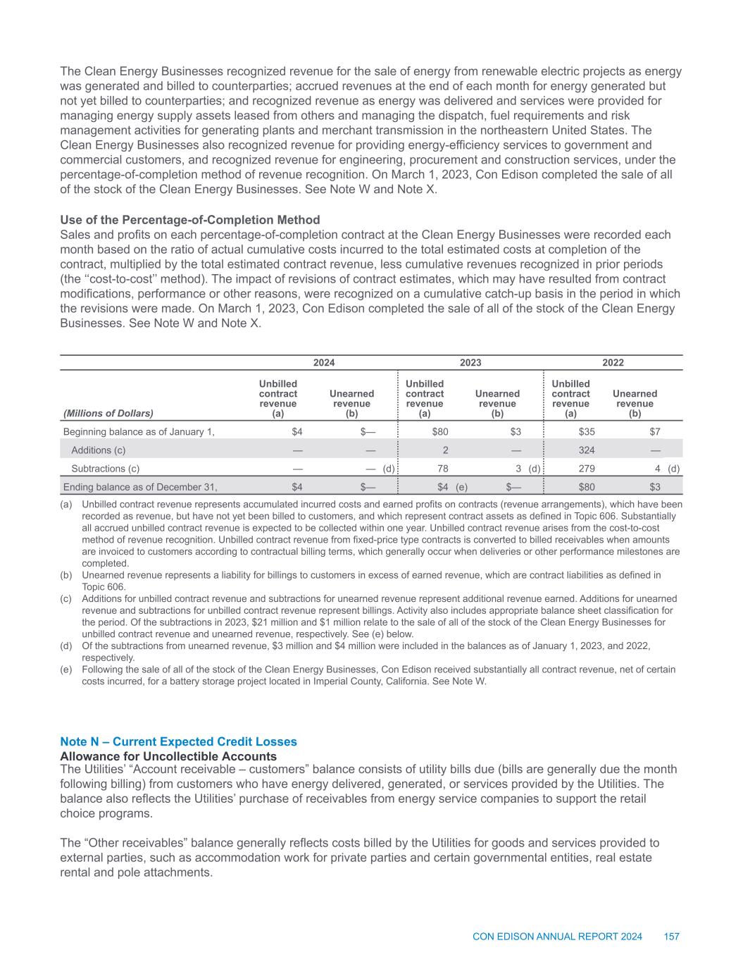 The Clean Energy Businesses recognized revenue for the sale of energy from renewable electric projects as energy was generated and billed to counterparties; accrued revenues at the end of each month for energy generated but not yet billed to counterparties; and recognized revenue as energy was delivered and services were provided for managing energy supply assets leased from others and managing the dispatch, fuel requirements and risk management activities for generating plants and merchant transmission in the northeastern United States. The Clean Energy Businesses also recognized revenue for providing energy-efficiency services to government and commercial customers, and recognized revenue for engineering, procurement and construction services, under the percentage-of-completion method of revenue recognition. On March 1, 2023, Con Edison completed the sale of all of the stock of the Clean Energy Businesses. See Note W and Note X. Use of the Percentage-of-Completion Method Sales and profits on each percentage-of-completion contract at the Clean Energy Businesses were recorded each month based on the ratio of actual cumulative costs incurred to the total estimated costs at completion of the contract, multiplied by the total estimated contract revenue, less cumulative revenues recognized in prior periods (the ‘‘cost-to-cost’’ method). The impact of revisions of contract estimates, which may have resulted from contract modifications, performance or other reasons, were recognized on a cumulative catch-up basis in the period in which the revisions were made. On March 1, 2023, Con Edison completed the sale of all of the stock of the Clean Energy Businesses. See Note W and Note X. 2024 2023 2022 (Millions of Dollars) Unbilled contract revenue (a) Unearned revenue (b) Unbilled contract revenue (a) Unearned revenue (b) Unbilled contract revenue (a) Unearned revenue (b) Beginning balance as of January 1, $4 $— $80 $3 $35 $7 Additions (c) — — 2 — 324 — Subtractions (c) — — (d) 78 3 (d) 279 4 (d) Ending balance as of December 31, $4 $— $4 (e) $— $80 $3 (a) Unbilled contract revenue represents accumulated incurred costs and earned profits on contracts (revenue arrangements), which have been recorded as revenue, but have not yet been billed to customers, and which represent contract assets as defined in Topic 606. Substantially all accrued unbilled contract revenue is expected to be collected within one year. Unbilled contract revenue arises from the cost-to-cost method of revenue recognition. Unbilled contract revenue from fixed-price type contracts is converted to billed receivables when amounts are invoiced to customers according to contractual billing terms, which generally occur when deliveries or other performance milestones are completed. (b) Unearned revenue represents a liability for billings to customers in excess of earned revenue, which are contract liabilities as defined in Topic 606. (c) Additions for unbilled contract revenue and subtractions for unearned revenue represent additional revenue earned. Additions for unearned revenue and subtractions for unbilled contract revenue represent billings. Activity also includes appropriate balance sheet classification for the period. Of the subtractions in 2023, $21 million and $1 million relate to the sale of all of the stock of the Clean Energy Businesses for unbilled contract revenue and unearned revenue, respectively. See (e) below. (d) Of the subtractions from unearned revenue, $3 million and $4 million were included in the balances as of January 1, 2023, and 2022, respectively. (e) Following the sale of all of the stock of the Clean Energy Businesses, Con Edison received substantially all contract revenue, net of certain costs incurred, for a battery storage project located in Imperial County, California. See Note W. Note N – Current Expected Credit Losses Allowance for Uncollectible Accounts The Utilities’ “Account receivable – customers” balance consists of utility bills due (bills are generally due the month following billing) from customers who have energy delivered, generated, or services provided by the Utilities. The balance also reflects the Utilities’ purchase of receivables from energy service companies to support the retail choice programs. The “Other receivables” balance generally reflects costs billed by the Utilities for goods and services provided to external parties, such as accommodation work for private parties and certain governmental entities, real estate rental and pole attachments. CON EDISON ANNUAL REPORT 2024 157