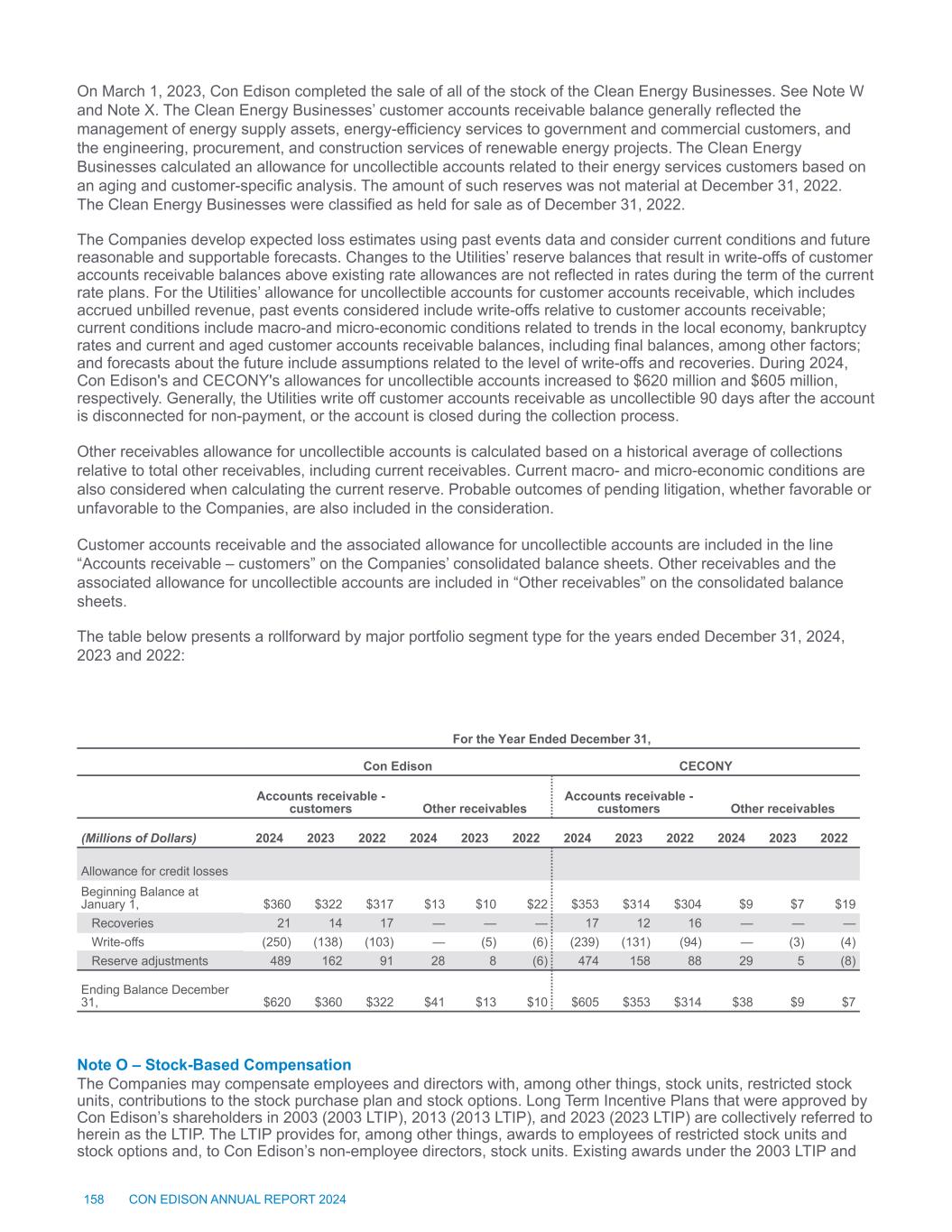 On March 1, 2023, Con Edison completed the sale of all of the stock of the Clean Energy Businesses. See Note W and Note X. The Clean Energy Businesses’ customer accounts receivable balance generally reflected the management of energy supply assets, energy-efficiency services to government and commercial customers, and the engineering, procurement, and construction services of renewable energy projects. The Clean Energy Businesses calculated an allowance for uncollectible accounts related to their energy services customers based on an aging and customer-specific analysis. The amount of such reserves was not material at December 31, 2022. The Clean Energy Businesses were classified as held for sale as of December 31, 2022. The Companies develop expected loss estimates using past events data and consider current conditions and future reasonable and supportable forecasts. Changes to the Utilities’ reserve balances that result in write-offs of customer accounts receivable balances above existing rate allowances are not reflected in rates during the term of the current rate plans. For the Utilities’ allowance for uncollectible accounts for customer accounts receivable, which includes accrued unbilled revenue, past events considered include write-offs relative to customer accounts receivable; current conditions include macro-and micro-economic conditions related to trends in the local economy, bankruptcy rates and current and aged customer accounts receivable balances, including final balances, among other factors; and forecasts about the future include assumptions related to the level of write-offs and recoveries. During 2024, Con Edison's and CECONY's allowances for uncollectible accounts increased to $620 million and $605 million, respectively. Generally, the Utilities write off customer accounts receivable as uncollectible 90 days after the account is disconnected for non-payment, or the account is closed during the collection process. Other receivables allowance for uncollectible accounts is calculated based on a historical average of collections relative to total other receivables, including current receivables. Current macro- and micro-economic conditions are also considered when calculating the current reserve. Probable outcomes of pending litigation, whether favorable or unfavorable to the Companies, are also included in the consideration. Customer accounts receivable and the associated allowance for uncollectible accounts are included in the line “Accounts receivable – customers” on the Companies’ consolidated balance sheets. Other receivables and the associated allowance for uncollectible accounts are included in “Other receivables” on the consolidated balance sheets. The table below presents a rollforward by major portfolio segment type for the years ended December 31, 2024, 2023 and 2022: For the Year Ended December 31, Con Edison CECONY Accounts receivable - customers Other receivables Accounts receivable - customers Other receivables (Millions of Dollars) 2024 2023 2022 2024 2023 2022 2024 2023 2022 2024 2023 2022 Allowance for credit losses Beginning Balance at January 1, $360 $322 $317 $13 $10 $22 $353 $314 $304 $9 $7 $19 Recoveries 21 14 17 — — — 17 12 16 — — — Write-offs (250) (138) (103) — (5) (6) (239) (131) (94) — (3) (4) Reserve adjustments 489 162 91 28 8 (6) 474 158 88 29 5 (8) Ending Balance December 31, $620 $360 $322 $41 $13 $10 $605 $353 $314 $38 $9 $7 Note O – Stock-Based Compensation The Companies may compensate employees and directors with, among other things, stock units, restricted stock units, contributions to the stock purchase plan and stock options. Long Term Incentive Plans that were approved by Con Edison’s shareholders in 2003 (2003 LTIP), 2013 (2013 LTIP), and 2023 (2023 LTIP) are collectively referred to herein as the LTIP. The LTIP provides for, among other things, awards to employees of restricted stock units and stock options and, to Con Edison’s non-employee directors, stock units. Existing awards under the 2003 LTIP and 158 CON EDISON ANNUAL REPORT 2024