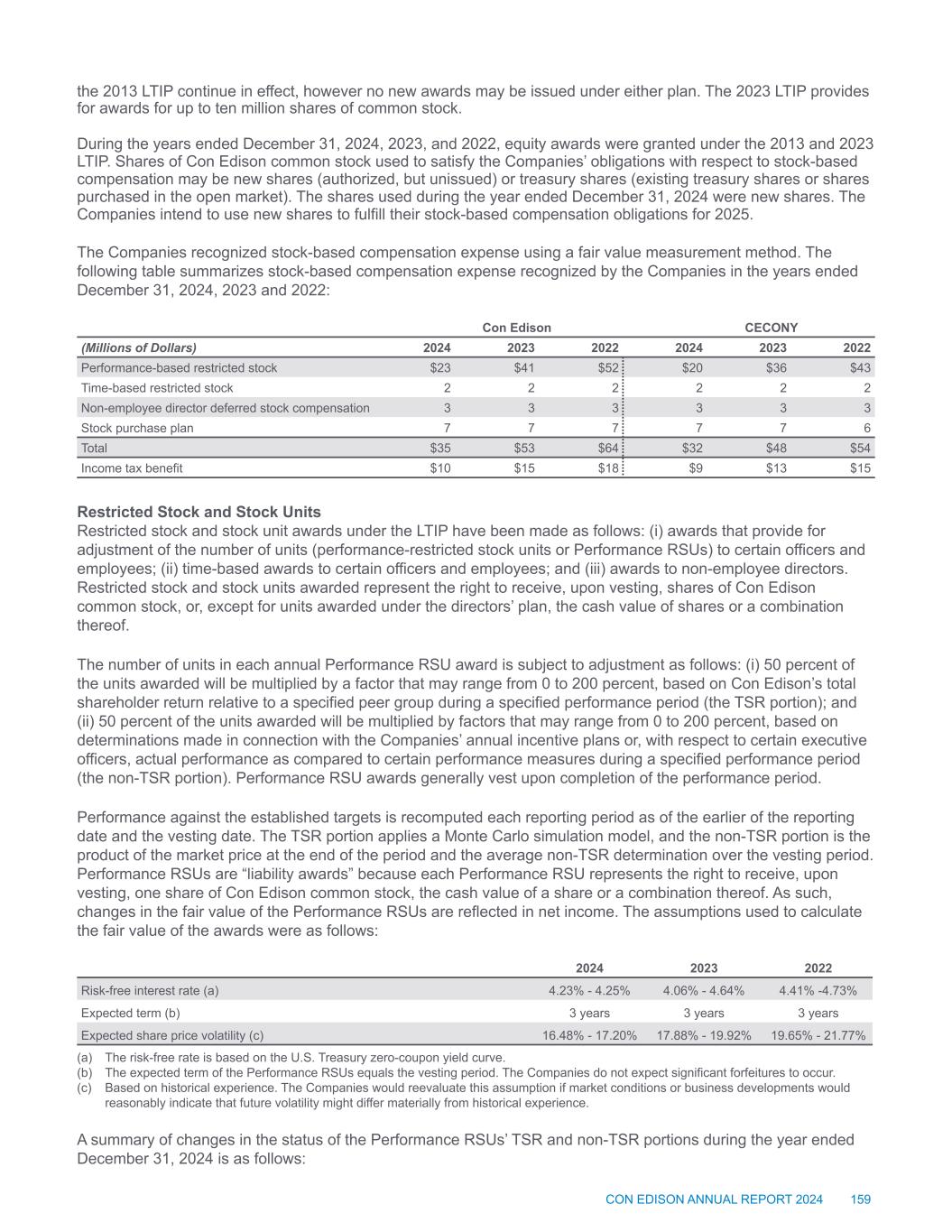 the 2013 LTIP continue in effect, however no new awards may be issued under either plan. The 2023 LTIP provides for awards for up to ten million shares of common stock. During the years ended December 31, 2024, 2023, and 2022, equity awards were granted under the 2013 and 2023 LTIP. Shares of Con Edison common stock used to satisfy the Companies’ obligations with respect to stock-based compensation may be new shares (authorized, but unissued) or treasury shares (existing treasury shares or shares purchased in the open market). The shares used during the year ended December 31, 2024 were new shares. The Companies intend to use new shares to fulfill their stock-based compensation obligations for 2025. The Companies recognized stock-based compensation expense using a fair value measurement method. The following table summarizes stock-based compensation expense recognized by the Companies in the years ended December 31, 2024, 2023 and 2022: Con Edison CECONY (Millions of Dollars) 2024 2023 2022 2024 2023 2022 Performance-based restricted stock $23 $41 $52 $20 $36 $43 Time-based restricted stock 2 2 2 2 2 2 Non-employee director deferred stock compensation 3 3 3 3 3 3 Stock purchase plan 7 7 7 7 7 6 Total $35 $53 $64 $32 $48 $54 Income tax benefit $10 $15 $18 $9 $13 $15 Restricted Stock and Stock Units Restricted stock and stock unit awards under the LTIP have been made as follows: (i) awards that provide for adjustment of the number of units (performance-restricted stock units or Performance RSUs) to certain officers and employees; (ii) time-based awards to certain officers and employees; and (iii) awards to non-employee directors. Restricted stock and stock units awarded represent the right to receive, upon vesting, shares of Con Edison common stock, or, except for units awarded under the directors’ plan, the cash value of shares or a combination thereof. The number of units in each annual Performance RSU award is subject to adjustment as follows: (i) 50 percent of the units awarded will be multiplied by a factor that may range from 0 to 200 percent, based on Con Edison’s total shareholder return relative to a specified peer group during a specified performance period (the TSR portion); and (ii) 50 percent of the units awarded will be multiplied by factors that may range from 0 to 200 percent, based on determinations made in connection with the Companies’ annual incentive plans or, with respect to certain executive officers, actual performance as compared to certain performance measures during a specified performance period (the non-TSR portion). Performance RSU awards generally vest upon completion of the performance period. Performance against the established targets is recomputed each reporting period as of the earlier of the reporting date and the vesting date. The TSR portion applies a Monte Carlo simulation model, and the non-TSR portion is the product of the market price at the end of the period and the average non-TSR determination over the vesting period. Performance RSUs are “liability awards” because each Performance RSU represents the right to receive, upon vesting, one share of Con Edison common stock, the cash value of a share or a combination thereof. As such, changes in the fair value of the Performance RSUs are reflected in net income. The assumptions used to calculate the fair value of the awards were as follows: 2024 2023 2022 Risk-free interest rate (a) 4.23% - 4.25% 4.06% - 4.64% 4.41% -4.73% Expected term (b) 3 years 3 years 3 years Expected share price volatility (c) 16.48% - 17.20% 17.88% - 19.92% 19.65% - 21.77% (a) The risk-free rate is based on the U.S. Treasury zero-coupon yield curve. (b) The expected term of the Performance RSUs equals the vesting period. The Companies do not expect significant forfeitures to occur. (c) Based on historical experience. The Companies would reevaluate this assumption if market conditions or business developments would reasonably indicate that future volatility might differ materially from historical experience. A summary of changes in the status of the Performance RSUs’ TSR and non-TSR portions during the year ended December 31, 2024 is as follows: CON EDISON ANNUAL REPORT 2024 159