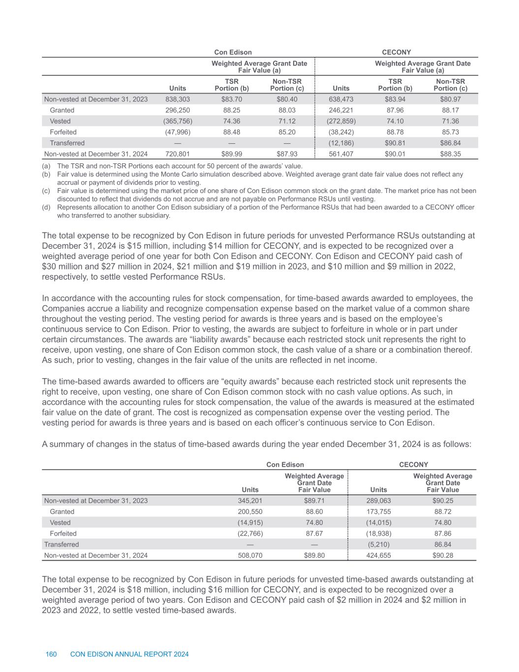 Con Edison CECONY Weighted Average Grant Date Fair Value (a) Weighted Average Grant Date Fair Value (a) Units TSR Portion (b) Non-TSR Portion (c) Units TSR Portion (b) Non-TSR Portion (c) Non-vested at December 31, 2023 838,303 $83.70 $80.40 638,473 $83.94 $80.97 Granted 296,250 88.25 88.03 246,221 87.96 88.17 Vested (365,756) 74.36 71.12 (272,859) 74.10 71.36 Forfeited (47,996) 88.48 85.20 (38,242) 88.78 85.73 Transferred — — — (12,186) $90.81 $86.84 Non-vested at December 31, 2024 720,801 $89.99 $87.93 561,407 $90.01 $88.35 (a) The TSR and non-TSR Portions each account for 50 percent of the awards’ value. (b) Fair value is determined using the Monte Carlo simulation described above. Weighted average grant date fair value does not reflect any accrual or payment of dividends prior to vesting. (c) Fair value is determined using the market price of one share of Con Edison common stock on the grant date. The market price has not been discounted to reflect that dividends do not accrue and are not payable on Performance RSUs until vesting. (d) Represents allocation to another Con Edison subsidiary of a portion of the Performance RSUs that had been awarded to a CECONY officer who transferred to another subsidiary. The total expense to be recognized by Con Edison in future periods for unvested Performance RSUs outstanding at December 31, 2024 is $15 million, including $14 million for CECONY, and is expected to be recognized over a weighted average period of one year for both Con Edison and CECONY. Con Edison and CECONY paid cash of $30 million and $27 million in 2024, $21 million and $19 million in 2023, and $10 million and $9 million in 2022, respectively, to settle vested Performance RSUs. In accordance with the accounting rules for stock compensation, for time-based awards awarded to employees, the Companies accrue a liability and recognize compensation expense based on the market value of a common share throughout the vesting period. The vesting period for awards is three years and is based on the employee’s continuous service to Con Edison. Prior to vesting, the awards are subject to forfeiture in whole or in part under certain circumstances. The awards are “liability awards” because each restricted stock unit represents the right to receive, upon vesting, one share of Con Edison common stock, the cash value of a share or a combination thereof. As such, prior to vesting, changes in the fair value of the units are reflected in net income. The time-based awards awarded to officers are “equity awards” because each restricted stock unit represents the right to receive, upon vesting, one share of Con Edison common stock with no cash value options. As such, in accordance with the accounting rules for stock compensation, the value of the awards is measured at the estimated fair value on the date of grant. The cost is recognized as compensation expense over the vesting period. The vesting period for awards is three years and is based on each officer’s continuous service to Con Edison. A summary of changes in the status of time-based awards during the year ended December 31, 2024 is as follows: Con Edison CECONY Units Weighted Average Grant Date Fair Value Units Weighted Average Grant Date Fair Value Non-vested at December 31, 2023 345,201 $89.71 289,063 $90.25 Granted 200,550 88.60 173,755 88.72 Vested (14,915) 74.80 (14,015) 74.80 Forfeited (22,766) 87.67 (18,938) 87.86 Transferred — — (5,210) 86.84 Non-vested at December 31, 2024 508,070 $89.80 424,655 $90.28 The total expense to be recognized by Con Edison in future periods for unvested time-based awards outstanding at December 31, 2024 is $18 million, including $16 million for CECONY, and is expected to be recognized over a weighted average period of two years. Con Edison and CECONY paid cash of $2 million in 2024 and $2 million in 2023 and 2022, to settle vested time-based awards. 160 CON EDISON ANNUAL REPORT 2024