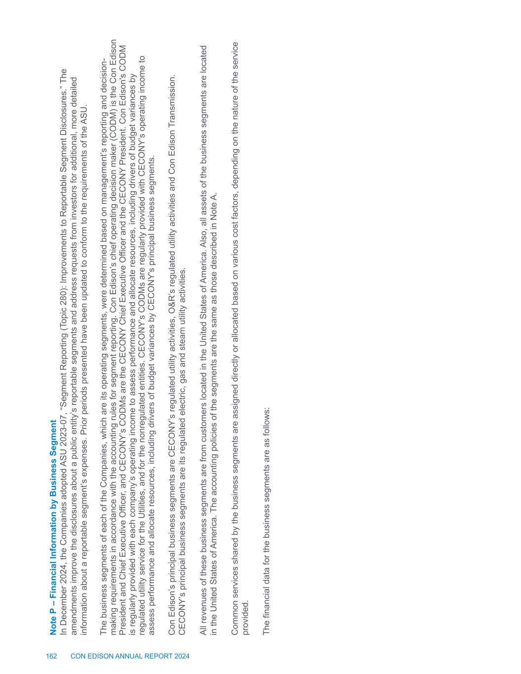 N ot e P – Fi na nc ia l I nf or m at io n by B us in es s Se gm en t In D ec em be r 2 02 4, th e C om pa ni es a do pt ed A S U 2 02 3- 07 , “ S eg m en t R ep or tin g (T op ic 2 80 ): Im pr ov em en ts to R ep or ta bl e S eg m en t D is cl os ur es .” Th e am en dm en ts im pr ov e th e di sc lo su re s ab ou t a p ub lic e nt ity ’s re po rta bl e se gm en ts a nd a dd re ss re qu es ts fr om in ve st or s fo r a dd iti on al , m or e de ta ile d in fo rm at io n ab ou t a re po rta bl e se gm en t’s e xp en se s. P rio r p er io ds p re se nt ed h av e be en u pd at ed to c on fo rm to th e re qu ire m en ts o f t he A S U . Th e bu si ne ss s eg m en ts o f e ac h of th e C om pa ni es , w hi ch a re it s op er at in g se gm en ts , w er e de te rm in ed b as ed o n m an ag em en t’s re po rti ng a nd d ec is io n- m ak in g re qu ire m en ts in a cc or da nc e w ith th e ac co un tin g ru le s fo r s eg m en t r ep or tin g. C on E di so n’ s ch ie f o pe ra tin g de ci si on m ak er (C O D M ) i s th e C on E di so n P re si de nt a nd C hi ef E xe cu tiv e O ffi ce r, an d C E C O N Y ’s C O D M s ar e th e C E C O N Y C hi ef E xe cu tiv e O ffi ce r a nd th e C E C O N Y P re si de nt . C on E di so n' s C O D M is re gu la rly p ro vi de d w ith e ac h co m pa ny ’s o pe ra tin g in co m e to a ss es s pe rfo rm an ce a nd a llo ca te re so ur ce s, in cl ud in g dr iv er s of b ud ge t v ar ia nc es b y re gu la te d ut ili ty s er vi ce fo r t he U til iti es , a nd fo r t he n on re gu la te d en tit ie s. C E C O N Y ’s C O D M s ar e re gu la rly p ro vi de d w ith C E C O N Y ’s o pe ra tin g in co m e to as se ss p er fo rm an ce a nd a llo ca te re so ur ce s, in cl ud in g dr iv er s of b ud ge t v ar ia nc es b y C E C O N Y 's p rin ci pa l b us in es s se gm en ts . C on E di so n’ s pr in ci pa l b us in es s se gm en ts a re C E C O N Y ’s re gu la te d ut ili ty a ct iv iti es , O & R ’s re gu la te d ut ili ty a ct iv iti es a nd C on E di so n Tr an sm is si on . C E C O N Y ’s p rin ci pa l b us in es s se gm en ts a re it s re gu la te d el ec tri c, g as a nd s te am u til ity a ct iv iti es . A ll re ve nu es o f t he se b us in es s se gm en ts a re fr om c us to m er s lo ca te d in th e U ni te d S ta te s of A m er ic a. A ls o, a ll as se ts o f t he b us in es s se gm en ts a re lo ca te d in th e U ni te d S ta te s of A m er ic a. T he a cc ou nt in g po lic ie s of th e se gm en ts a re th e sa m e as th os e de sc rib ed in N ot e A . C om m on s er vi ce s sh ar ed b y th e bu si ne ss s eg m en ts a re a ss ig ne d di re ct ly o r a llo ca te d ba se d on v ar io us c os t f ac to rs , d ep en di ng o n th e na tu re o f t he s er vi ce pr ov id ed . Th e fin an ci al d at a fo r t he b us in es s se gm en ts a re a s fo llo w s: 162 CON EDISON ANNUAL REPORT 2024