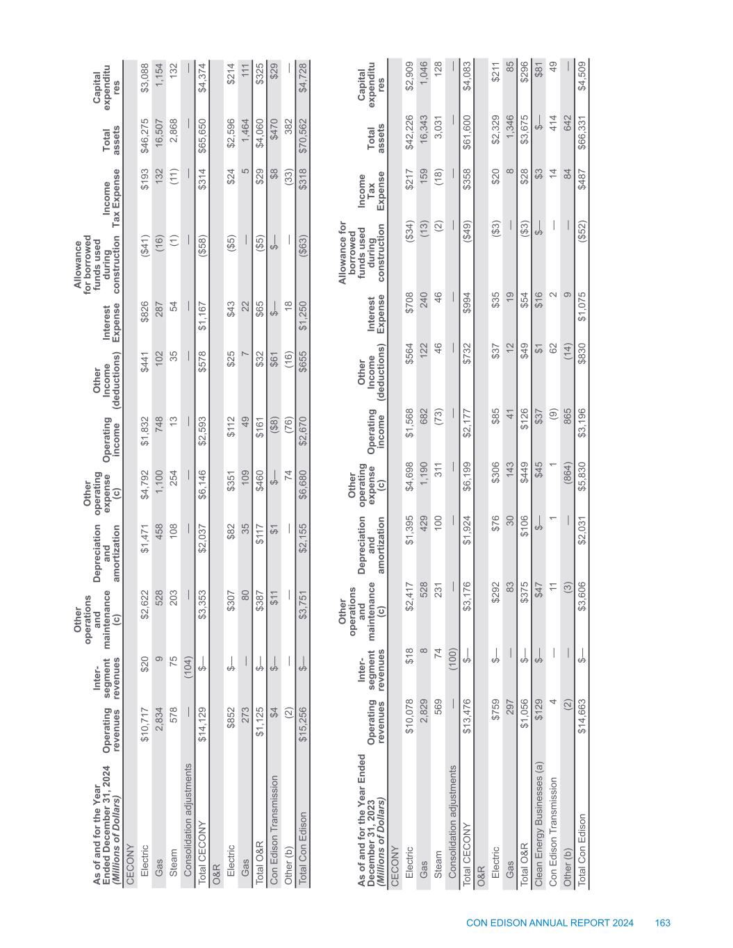 A s of a nd fo r t he Y ea r En de d D ec em be r 3 1, 2 02 4 (M ill io ns o f D ol la rs ) O pe ra tin g re ve nu es In te r- se gm en t re ve nu es O th er op er at io ns an d m ai nt en an ce (c ) D ep re ci at io n an d am or tiz at io n O th er op er at in g ex pe ns e (c ) O pe ra tin g in co m e O th er In co m e (d ed uc tio ns ) In te re st Ex pe ns e A llo w an ce fo r b or ro w ed fu nd s us ed du rin g co ns tr uc tio n In co m e Ta x Ex pe ns e To ta l as se ts C ap ita l ex pe nd itu re s C E C O N Y E le ct ric $1 0, 71 7 $2 0 $2 ,6 22 $1 ,4 71 $4 ,7 92 $1 ,8 32 $4 41 $8 26 ($ 41 ) $1 93 $4 6, 27 5 $3 ,0 88 G as 2, 83 4 9 52 8 45 8 1, 10 0 74 8 10 2 28 7 (1 6) 13 2 16 ,5 07 1, 15 4 S te am 57 8 75 20 3 10 8 25 4 13 35 54 (1 ) (1 1) 2, 86 8 13 2 C on so lid at io n ad ju st m en ts — (1 04 ) — — — — — — — — — — To ta l C E C O N Y $1 4, 12 9 $— $3 ,3 53 $2 ,0 37 $6 ,1 46 $2 ,5 93 $5 78 $1 ,1 67 ($ 58 ) $3 14 $6 5, 65 0 $4 ,3 74 O & R E le ct ric $8 52 $— $3 07 $8 2 $3 51 $1 12 $2 5 $4 3 ($ 5) $2 4 $2 ,5 96 $2 14 G as 27 3 — 80 35 10 9 49 7 22 — 5 1, 46 4 11 1 To ta l O & R $1 ,1 25 $— $3 87 $1 17 $4 60 $1 61 $3 2 $6 5 ($ 5) $2 9 $4 ,0 60 $3 25 C on E di so n Tr an sm is si on $4 $— $1 1 $1 $— ($ 8) $6 1 $— $— $8 $4 70 $2 9 O th er (b ) (2 ) — — — 74 (7 6) (1 6) 18 — (3 3) 38 2 — To ta l C on E di so n $1 5, 25 6 $— $3 ,7 51 $2 ,1 55 $6 ,6 80 $2 ,6 70 $6 55 $1 ,2 50 ($ 63 ) $3 18 $7 0, 56 2 $4 ,7 28 A s of a nd fo r t he Y ea r E nd ed D ec em be r 3 1, 2 02 3 (M ill io ns o f D ol la rs ) O pe ra tin g re ve nu es In te r- se gm en t re ve nu es O th er op er at io ns an d m ai nt en an ce (c ) D ep re ci at io n an d am or tiz at io n O th er op er at in g ex pe ns e (c ) O pe ra tin g in co m e O th er In co m e (d ed uc tio ns ) In te re st Ex pe ns e A llo w an ce fo r bo rr ow ed fu nd s us ed du rin g co ns tr uc tio n In co m e Ta x Ex pe ns e To ta l as se ts C ap ita l ex pe nd itu re s C E C O N Y E le ct ric $1 0, 07 8 $1 8 $2 ,4 17 $1 ,3 95 $4 ,6 98 $1 ,5 68 $5 64 $7 08 ($ 34 ) $2 17 $4 2, 22 6 $2 ,9 09 G as 2, 82 9 8 52 8 42 9 1, 19 0 68 2 12 2 24 0 (1 3) 15 9 16 ,3 43 1, 04 6 S te am 56 9 74 23 1 10 0 31 1 (7 3) 46 46 (2 ) (1 8) 3, 03 1 12 8 C on so lid at io n ad ju st m en ts — (1 00 ) — — — — — — — — — — To ta l C E C O N Y $1 3, 47 6 $— $3 ,1 76 $1 ,9 24 $6 ,1 99 $2 ,1 77 $7 32 $9 94 ($ 49 ) $3 58 $6 1, 60 0 $4 ,0 83 O & R E le ct ric $7 59 $— $2 92 $7 6 $3 06 $8 5 $3 7 $3 5 ($ 3) $2 0 $2 ,3 29 $2 11 G as 29 7 — 83 30 14 3 41 12 19 — 8 1, 34 6 85 To ta l O & R $1 ,0 56 $— $3 75 $1 06 $4 49 $1 26 $4 9 $5 4 ($ 3) $2 8 $3 ,6 75 $2 96 C le an E ne rg y B us in es se s (a ) $1 29 $— $4 7 $— $4 5 $3 7 $1 $1 6 $— $3 $— $8 1 C on E di so n Tr an sm is si on 4 — 11 1 1 (9 ) 62 2 — 14 41 4 49 O th er (b ) (2 ) — (3 ) — (8 64 ) 86 5 (1 4) 9 — 84 64 2 — To ta l C on E di so n $1 4, 66 3 $— $3 ,6 06 $2 ,0 31 $5 ,8 30 $3 ,1 96 $8 30 $1 ,0 75 ($ 52 ) $4 87 $6 6, 33 1 $4 ,5 09 CON EDISON ANNUAL REPORT 2024 163