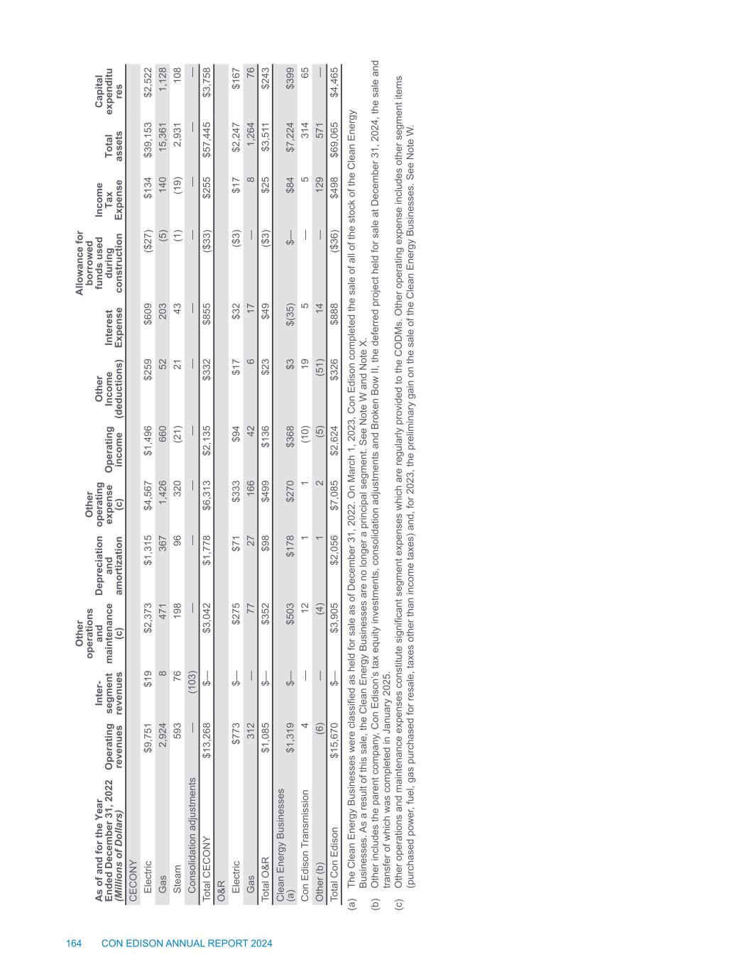 A s of a nd fo r t he Y ea r En de d D ec em be r 3 1, 2 02 2 (M ill io ns o f D ol la rs ) O pe ra tin g re ve nu es In te r- se gm en t re ve nu es O th er op er at io ns an d m ai nt en an ce (c ) D ep re ci at io n an d am or tiz at io n O th er op er at in g ex pe ns e (c ) O pe ra tin g in co m e O th er In co m e (d ed uc tio ns ) In te re st Ex pe ns e A llo w an ce fo r bo rr ow ed fu nd s us ed du rin g co ns tr uc tio n In co m e Ta x Ex pe ns e To ta l as se ts C ap ita l ex pe nd itu re s C E C O N Y E le ct ric $9 ,7 51 $1 9 $2 ,3 73 $1 ,3 15 $4 ,5 67 $1 ,4 96 $2 59 $6 09 ($ 27 ) $1 34 $3 9, 15 3 $2 ,5 22 G as 2, 92 4 8 47 1 36 7 1, 42 6 66 0 52 20 3 (5 ) 14 0 15 ,3 61 1, 12 8 S te am 59 3 76 19 8 96 32 0 (2 1) 21 43 (1 ) (1 9) 2, 93 1 10 8 C on so lid at io n ad ju st m en ts — (1 03 ) — — — — — — — — — — To ta l C E C O N Y $1 3, 26 8 $— $3 ,0 42 $1 ,7 78 $6 ,3 13 $2 ,1 35 $3 32 $8 55 ($ 33 ) $2 55 $5 7, 44 5 $3 ,7 58 O & R E le ct ric $7 73 $— $2 75 $7 1 $3 33 $9 4 $1 7 $3 2 ($ 3) $1 7 $2 ,2 47 $1 67 G as 31 2 — 77 27 16 6 42 6 17 — 8 1, 26 4 76 To ta l O & R $1 ,0 85 $— $3 52 $9 8 $4 99 $1 36 $2 3 $4 9 ($ 3) $2 5 $3 ,5 11 $2 43 C le an E ne rg y B us in es se s (a ) $1 ,3 19 $— $5 03 $1 78 $2 70 $3 68 $3 $( 35 ) $— $8 4 $7 ,2 24 $3 99 C on E di so n Tr an sm is si on 4 — 12 1 1 (1 0) 19 5 — 5 31 4 65 O th er (b ) (6 ) — (4 ) 1 2 (5 ) (5 1) 14 — 12 9 57 1 — To ta l C on E di so n $1 5, 67 0 $— $3 ,9 05 $2 ,0 56 $7 ,0 85 $2 ,6 24 $3 26 $8 88 ($ 36 ) $4 98 $6 9, 06 5 $4 ,4 65 (a ) Th e C le an E ne rg y B us in es se s w er e cl as si fie d as h el d fo r s al e as o f D ec em be r 3 1, 2 02 2. O n M ar ch 1 , 2 02 3, C on E di so n co m pl et ed th e sa le o f a ll of th e st oc k of th e C le an E ne rg y B us in es se s. A s a re su lt of th is s al e, th e C le an E ne rg y B us in es se s ar e no lo ng er a p rin ci pa l s eg m en t. S ee N ot e W a nd N ot e X . (b ) O th er in cl ud es th e pa re nt c om pa ny , C on E di so n’ s ta x eq ui ty in ve st m en ts , c on so lid at io n ad ju st m en ts a nd B ro ke n B ow II , t he d ef er re d pr oj ec t h el d fo r s al e at D ec em be r 3 1, 2 02 4, th e sa le a nd tra ns fe r o f w hi ch w as c om pl et ed in J an ua ry 2 02 5. (c ) O th er o pe ra tio ns a nd m ai nt en an ce e xp en se s co ns tit ut e si gn ifi ca nt s eg m en t e xp en se s w hi ch a re re gu la rly p ro vi de d to th e C O D M s. O th er o pe ra tin g ex pe ns e in cl ud es o th er s eg m en t i te m s (p ur ch as ed p ow er , f ue l, ga s pu rc ha se d fo r r es al e, ta xe s ot he r t ha n in co m e ta xe s) a nd , f or 2 02 3, th e pr el im in ar y ga in o n th e sa le o f t he C le an E ne rg y B us in es se s. S ee N ot e W . 164 CON EDISON ANNUAL REPORT 2024