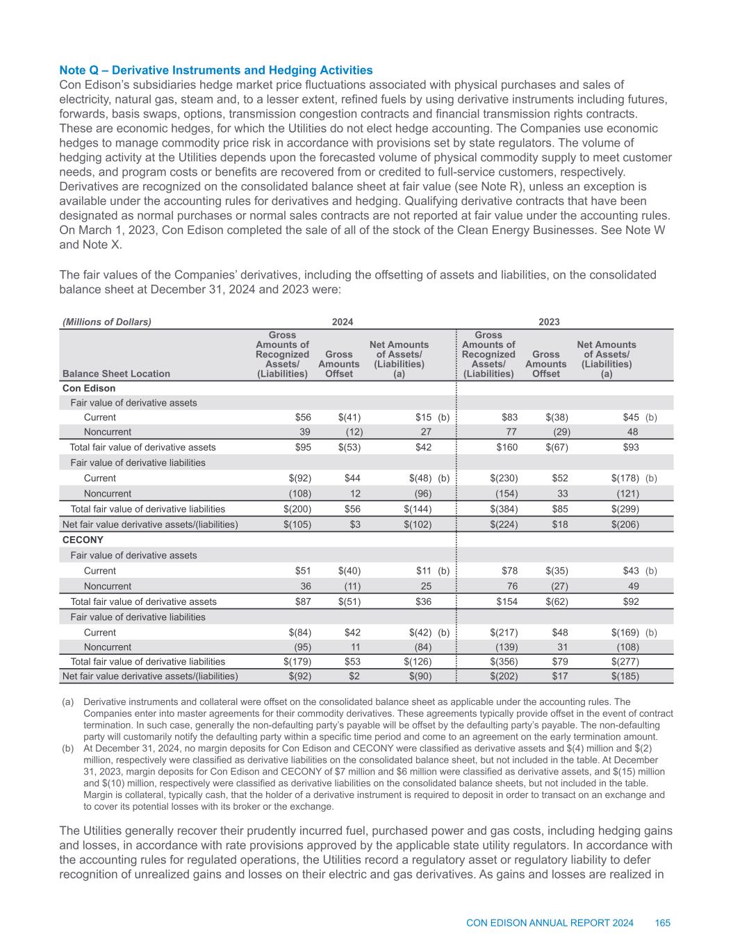 Note Q – Derivative Instruments and Hedging Activities Con Edison’s subsidiaries hedge market price fluctuations associated with physical purchases and sales of electricity, natural gas, steam and, to a lesser extent, refined fuels by using derivative instruments including futures, forwards, basis swaps, options, transmission congestion contracts and financial transmission rights contracts. These are economic hedges, for which the Utilities do not elect hedge accounting. The Companies use economic hedges to manage commodity price risk in accordance with provisions set by state regulators. The volume of hedging activity at the Utilities depends upon the forecasted volume of physical commodity supply to meet customer needs, and program costs or benefits are recovered from or credited to full-service customers, respectively. Derivatives are recognized on the consolidated balance sheet at fair value (see Note R), unless an exception is available under the accounting rules for derivatives and hedging. Qualifying derivative contracts that have been designated as normal purchases or normal sales contracts are not reported at fair value under the accounting rules. On March 1, 2023, Con Edison completed the sale of all of the stock of the Clean Energy Businesses. See Note W and Note X. The fair values of the Companies’ derivatives, including the offsetting of assets and liabilities, on the consolidated balance sheet at December 31, 2024 and 2023 were: (Millions of Dollars) 2024 2023 Balance Sheet Location Gross Amounts of Recognized Assets/ (Liabilities) Gross Amounts Offset Net Amounts of Assets/ (Liabilities) (a) Gross Amounts of Recognized Assets/ (Liabilities) Gross Amounts Offset Net Amounts of Assets/ (Liabilities) (a) Con Edison Fair value of derivative assets Current $56 $(41) $15 (b) $83 $(38) $45 (b) Noncurrent 39 (12) 27 77 (29) 48 Total fair value of derivative assets $95 $(53) $42 $160 $(67) $93 Fair value of derivative liabilities Current $(92) $44 $(48) (b) $(230) $52 $(178) (b) Noncurrent (108) 12 (96) (154) 33 (121) Total fair value of derivative liabilities $(200) $56 $(144) $(384) $85 $(299) Net fair value derivative assets/(liabilities) $(105) $3 $(102) $(224) $18 $(206) CECONY Fair value of derivative assets Current $51 $(40) $11 (b) $78 $(35) $43 (b) Noncurrent 36 (11) 25 76 (27) 49 Total fair value of derivative assets $87 $(51) $36 $154 $(62) $92 Fair value of derivative liabilities Current $(84) $42 $(42) (b) $(217) $48 $(169) (b) Noncurrent (95) 11 (84) (139) 31 (108) Total fair value of derivative liabilities $(179) $53 $(126) $(356) $79 $(277) Net fair value derivative assets/(liabilities) $(92) $2 $(90) $(202) $17 $(185) (a) Derivative instruments and collateral were offset on the consolidated balance sheet as applicable under the accounting rules. The Companies enter into master agreements for their commodity derivatives. These agreements typically provide offset in the event of contract termination. In such case, generally the non-defaulting party’s payable will be offset by the defaulting party’s payable. The non-defaulting party will customarily notify the defaulting party within a specific time period and come to an agreement on the early termination amount. (b) At December 31, 2024, no margin deposits for Con Edison and CECONY were classified as derivative assets and $(4) million and $(2) million, respectively were classified as derivative liabilities on the consolidated balance sheet, but not included in the table. At December 31, 2023, margin deposits for Con Edison and CECONY of $7 million and $6 million were classified as derivative assets, and $(15) million and $(10) million, respectively were classified as derivative liabilities on the consolidated balance sheets, but not included in the table. Margin is collateral, typically cash, that the holder of a derivative instrument is required to deposit in order to transact on an exchange and to cover its potential losses with its broker or the exchange. The Utilities generally recover their prudently incurred fuel, purchased power and gas costs, including hedging gains and losses, in accordance with rate provisions approved by the applicable state utility regulators. In accordance with the accounting rules for regulated operations, the Utilities record a regulatory asset or regulatory liability to defer recognition of unrealized gains and losses on their electric and gas derivatives. As gains and losses are realized in CON EDISON ANNUAL REPORT 2024 165