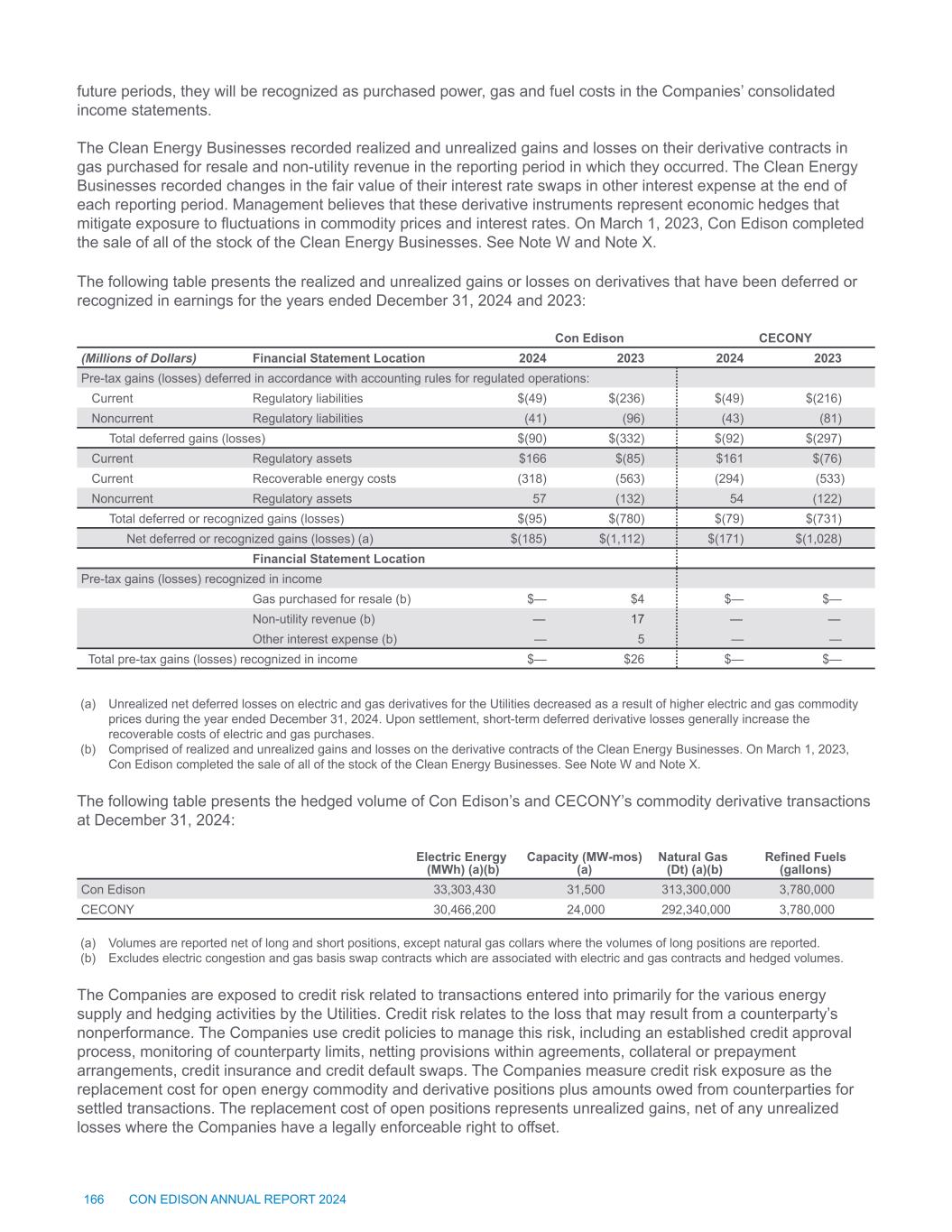 future periods, they will be recognized as purchased power, gas and fuel costs in the Companies’ consolidated income statements. The Clean Energy Businesses recorded realized and unrealized gains and losses on their derivative contracts in gas purchased for resale and non-utility revenue in the reporting period in which they occurred. The Clean Energy Businesses recorded changes in the fair value of their interest rate swaps in other interest expense at the end of each reporting period. Management believes that these derivative instruments represent economic hedges that mitigate exposure to fluctuations in commodity prices and interest rates. On March 1, 2023, Con Edison completed the sale of all of the stock of the Clean Energy Businesses. See Note W and Note X. The following table presents the realized and unrealized gains or losses on derivatives that have been deferred or recognized in earnings for the years ended December 31, 2024 and 2023: Con Edison CECONY (Millions of Dollars) Financial Statement Location 2024 2023 2024 2023 Pre-tax gains (losses) deferred in accordance with accounting rules for regulated operations: Current Regulatory liabilities $(49) $(236) $(49) $(216) Noncurrent Regulatory liabilities (41) (96) (43) (81) Total deferred gains (losses) $(90) $(332) $(92) $(297) Current Regulatory assets $166 $(85) $161 $(76) Current Recoverable energy costs (318) (563) (294) (533) Noncurrent Regulatory assets 57 (132) 54 (122) Total deferred or recognized gains (losses) $(95) $(780) $(79) $(731) Net deferred or recognized gains (losses) (a) $(185) $(1,112) $(171) $(1,028) Financial Statement Location Pre-tax gains (losses) recognized in income Gas purchased for resale (b) $— $4 $— $— Non-utility revenue (b) — 17 — — Other interest expense (b) — 5 — — Total pre-tax gains (losses) recognized in income $— $26 $— $— (a) Unrealized net deferred losses on electric and gas derivatives for the Utilities decreased as a result of higher electric and gas commodity prices during the year ended December 31, 2024. Upon settlement, short-term deferred derivative losses generally increase the recoverable costs of electric and gas purchases. (b) Comprised of realized and unrealized gains and losses on the derivative contracts of the Clean Energy Businesses. On March 1, 2023, Con Edison completed the sale of all of the stock of the Clean Energy Businesses. See Note W and Note X. The following table presents the hedged volume of Con Edison’s and CECONY’s commodity derivative transactions at December 31, 2024: Electric Energy (MWh) (a)(b) Capacity (MW-mos) (a) Natural Gas (Dt) (a)(b) Refined Fuels (gallons) Con Edison 33,303,430 31,500 313,300,000 3,780,000 CECONY 30,466,200 24,000 292,340,000 3,780,000 (a) Volumes are reported net of long and short positions, except natural gas collars where the volumes of long positions are reported. (b) Excludes electric congestion and gas basis swap contracts which are associated with electric and gas contracts and hedged volumes. The Companies are exposed to credit risk related to transactions entered into primarily for the various energy supply and hedging activities by the Utilities. Credit risk relates to the loss that may result from a counterparty’s nonperformance. The Companies use credit policies to manage this risk, including an established credit approval process, monitoring of counterparty limits, netting provisions within agreements, collateral or prepayment arrangements, credit insurance and credit default swaps. The Companies measure credit risk exposure as the replacement cost for open energy commodity and derivative positions plus amounts owed from counterparties for settled transactions. The replacement cost of open positions represents unrealized gains, net of any unrealized losses where the Companies have a legally enforceable right to offset. 166 CON EDISON ANNUAL REPORT 2024