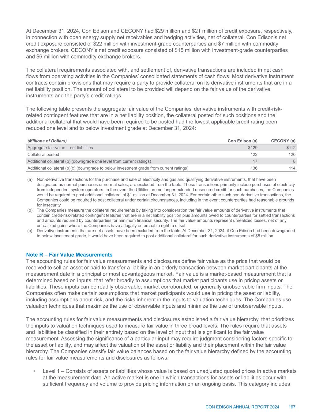 At December 31, 2024, Con Edison and CECONY had $29 million and $21 million of credit exposure, respectively, in connection with open energy supply net receivables and hedging activities, net of collateral. Con Edison’s net credit exposure consisted of $22 million with investment-grade counterparties and $7 million with commodity exchange brokers. CECONY’s net credit exposure consisted of $15 million with investment-grade counterparties and $6 million with commodity exchange brokers. The collateral requirements associated with, and settlement of, derivative transactions are included in net cash flows from operating activities in the Companies’ consolidated statements of cash flows. Most derivative instrument contracts contain provisions that may require a party to provide collateral on its derivative instruments that are in a net liability position. The amount of collateral to be provided will depend on the fair value of the derivative instruments and the party’s credit ratings. The following table presents the aggregate fair value of the Companies’ derivative instruments with credit-risk- related contingent features that are in a net liability position, the collateral posted for such positions and the additional collateral that would have been required to be posted had the lowest applicable credit rating been reduced one level and to below investment grade at December 31, 2024: (Millions of Dollars) Con Edison (a) CECONY (a) Aggregate fair value – net liabilities $129 $112 Collateral posted 122 120 Additional collateral (b) (downgrade one level from current ratings) 17 8 Additional collateral (b)(c) (downgrade to below investment grade from current ratings) 136 114 (a) Non-derivative transactions for the purchase and sale of electricity and gas and qualifying derivative instruments, that have been designated as normal purchases or normal sales, are excluded from the table. These transactions primarily include purchases of electricity from independent system operators. In the event the Utilities are no longer extended unsecured credit for such purchases, the Companies would be required to post additional collateral of $1 million at December 31, 2024. For certain other such non-derivative transactions, the Companies could be required to post collateral under certain circumstances, including in the event counterparties had reasonable grounds for insecurity. (b) The Companies measure the collateral requirements by taking into consideration the fair value amounts of derivative instruments that contain credit-risk-related contingent features that are in a net liability position plus amounts owed to counterparties for settled transactions and amounts required by counterparties for minimum financial security. The fair value amounts represent unrealized losses, net of any unrealized gains where the Companies have a legally enforceable right to offset. (c) Derivative instruments that are net assets have been excluded from the table. At December 31, 2024, if Con Edison had been downgraded to below investment grade, it would have been required to post additional collateral for such derivative instruments of $8 million. Note R – Fair Value Measurements The accounting rules for fair value measurements and disclosures define fair value as the price that would be received to sell an asset or paid to transfer a liability in an orderly transaction between market participants at the measurement date in a principal or most advantageous market. Fair value is a market-based measurement that is determined based on inputs, that refer broadly to assumptions that market participants use in pricing assets or liabilities. These inputs can be readily observable, market corroborated, or generally unobservable firm inputs. The Companies often make certain assumptions that market participants would use in pricing the asset or liability, including assumptions about risk, and the risks inherent in the inputs to valuation techniques. The Companies use valuation techniques that maximize the use of observable inputs and minimize the use of unobservable inputs. The accounting rules for fair value measurements and disclosures established a fair value hierarchy, that prioritizes the inputs to valuation techniques used to measure fair value in three broad levels. The rules require that assets and liabilities be classified in their entirety based on the level of input that is significant to the fair value measurement. Assessing the significance of a particular input may require judgment considering factors specific to the asset or liability, and may affect the valuation of the asset or liability and their placement within the fair value hierarchy. The Companies classify fair value balances based on the fair value hierarchy defined by the accounting rules for fair value measurements and disclosures as follows: • Level 1 – Consists of assets or liabilities whose value is based on unadjusted quoted prices in active markets at the measurement date. An active market is one in which transactions for assets or liabilities occur with sufficient frequency and volume to provide pricing information on an ongoing basis. This category includes CON EDISON ANNUAL REPORT 2024 167