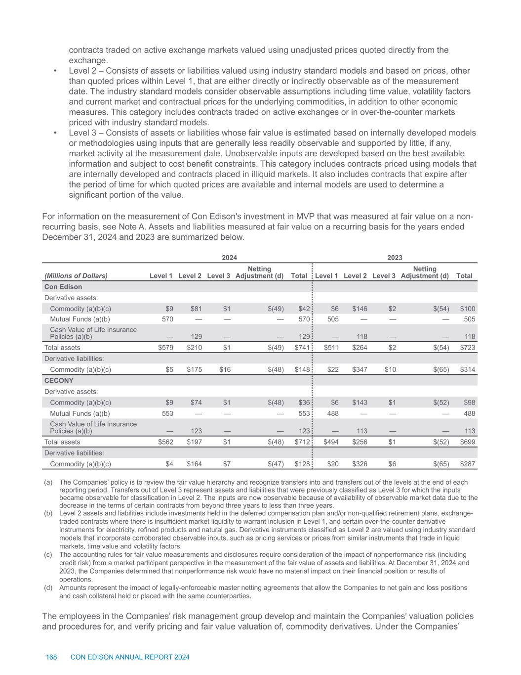 contracts traded on active exchange markets valued using unadjusted prices quoted directly from the exchange. • Level 2 – Consists of assets or liabilities valued using industry standard models and based on prices, other than quoted prices within Level 1, that are either directly or indirectly observable as of the measurement date. The industry standard models consider observable assumptions including time value, volatility factors and current market and contractual prices for the underlying commodities, in addition to other economic measures. This category includes contracts traded on active exchanges or in over-the-counter markets priced with industry standard models. • Level 3 – Consists of assets or liabilities whose fair value is estimated based on internally developed models or methodologies using inputs that are generally less readily observable and supported by little, if any, market activity at the measurement date. Unobservable inputs are developed based on the best available information and subject to cost benefit constraints. This category includes contracts priced using models that are internally developed and contracts placed in illiquid markets. It also includes contracts that expire after the period of time for which quoted prices are available and internal models are used to determine a significant portion of the value. For information on the measurement of Con Edison's investment in MVP that was measured at fair value on a non- recurring basis, see Note A. Assets and liabilities measured at fair value on a recurring basis for the years ended December 31, 2024 and 2023 are summarized below. 2024 2023 (Millions of Dollars) Level 1 Level 2 Level 3 Netting Adjustment (d) Total Level 1 Level 2 Level 3 Netting Adjustment (d) Total Con Edison Derivative assets: Commodity (a)(b)(c) $9 $81 $1 $(49) $42 $6 $146 $2 $(54) $100 Mutual Funds (a)(b) 570 — — — 570 505 — — — 505 Cash Value of Life Insurance Policies (a)(b) — 129 — — 129 — 118 — — 118 Total assets $579 $210 $1 $(49) $741 $511 $264 $2 $(54) $723 Derivative liabilities: Commodity (a)(b)(c) $5 $175 $16 $(48) $148 $22 $347 $10 $(65) $314 CECONY Derivative assets: Commodity (a)(b)(c) $9 $74 $1 $(48) $36 $6 $143 $1 $(52) $98 Mutual Funds (a)(b) 553 — — — 553 488 — — — 488 Cash Value of Life Insurance Policies (a)(b) — 123 — — 123 — 113 — — 113 Total assets $562 $197 $1 $(48) $712 $494 $256 $1 $(52) $699 Derivative liabilities: Commodity (a)(b)(c) $4 $164 $7 $(47) $128 $20 $326 $6 $(65) $287 (a) The Companies’ policy is to review the fair value hierarchy and recognize transfers into and transfers out of the levels at the end of each reporting period. Transfers out of Level 3 represent assets and liabilities that were previously classified as Level 3 for which the inputs became observable for classification in Level 2. The inputs are now observable because of availability of observable market data due to the decrease in the terms of certain contracts from beyond three years to less than three years. (b) Level 2 assets and liabilities include investments held in the deferred compensation plan and/or non-qualified retirement plans, exchange- traded contracts where there is insufficient market liquidity to warrant inclusion in Level 1, and certain over-the-counter derivative instruments for electricity, refined products and natural gas. Derivative instruments classified as Level 2 are valued using industry standard models that incorporate corroborated observable inputs, such as pricing services or prices from similar instruments that trade in liquid markets, time value and volatility factors. (c) The accounting rules for fair value measurements and disclosures require consideration of the impact of nonperformance risk (including credit risk) from a market participant perspective in the measurement of the fair value of assets and liabilities. At December 31, 2024 and 2023, the Companies determined that nonperformance risk would have no material impact on their financial position or results of operations. (d) Amounts represent the impact of legally-enforceable master netting agreements that allow the Companies to net gain and loss positions and cash collateral held or placed with the same counterparties. The employees in the Companies’ risk management group develop and maintain the Companies’ valuation policies and procedures for, and verify pricing and fair value valuation of, commodity derivatives. Under the Companies’ 168 CON EDISON ANNUAL REPORT 2024