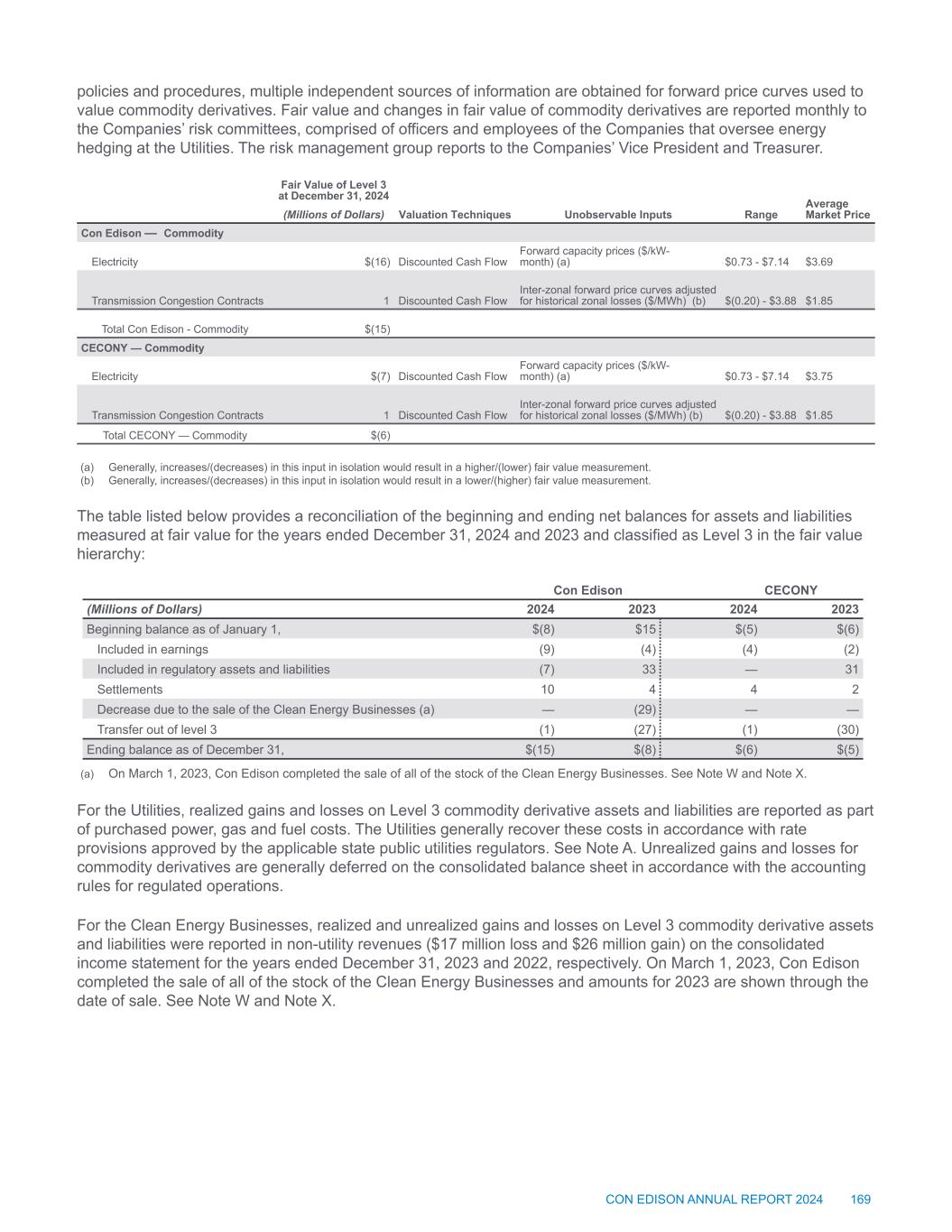 policies and procedures, multiple independent sources of information are obtained for forward price curves used to value commodity derivatives. Fair value and changes in fair value of commodity derivatives are reported monthly to the Companies’ risk committees, comprised of officers and employees of the Companies that oversee energy hedging at the Utilities. The risk management group reports to the Companies’ Vice President and Treasurer. Fair Value of Level 3 at December 31, 2024 Average Market Price(Millions of Dollars) Valuation Techniques Unobservable Inputs Range Con Edison — Commodity Electricity $(16) Discounted Cash Flow Forward capacity prices ($/kW- month) (a) $0.73 - $7.14 $3.69 Transmission Congestion Contracts 1 Discounted Cash Flow Inter-zonal forward price curves adjusted for historical zonal losses ($/MWh) (b) $(0.20) - $3.88 $1.85 Total Con Edison - Commodity $(15) CECONY — Commodity Electricity $(7) Discounted Cash Flow Forward capacity prices ($/kW- month) (a) $0.73 - $7.14 $3.75 Transmission Congestion Contracts 1 Discounted Cash Flow Inter-zonal forward price curves adjusted for historical zonal losses ($/MWh) (b) $(0.20) - $3.88 $1.85 Total CECONY — Commodity $(6) (a) Generally, increases/(decreases) in this input in isolation would result in a higher/(lower) fair value measurement. (b) Generally, increases/(decreases) in this input in isolation would result in a lower/(higher) fair value measurement. The table listed below provides a reconciliation of the beginning and ending net balances for assets and liabilities measured at fair value for the years ended December 31, 2024 and 2023 and classified as Level 3 in the fair value hierarchy: Con Edison CECONY (Millions of Dollars) 2024 2023 2024 2023 Beginning balance as of January 1, $(8) $15 $(5) $(6) Included in earnings (9) (4) (4) (2) Included in regulatory assets and liabilities (7) 33 — 31 Settlements 10 4 4 2 Decrease due to the sale of the Clean Energy Businesses (a) — (29) — — Transfer out of level 3 (1) (27) (1) (30) Ending balance as of December 31, $(15) $(8) $(6) $(5) (a) On March 1, 2023, Con Edison completed the sale of all of the stock of the Clean Energy Businesses. See Note W and Note X. For the Utilities, realized gains and losses on Level 3 commodity derivative assets and liabilities are reported as part of purchased power, gas and fuel costs. The Utilities generally recover these costs in accordance with rate provisions approved by the applicable state public utilities regulators. See Note A. Unrealized gains and losses for commodity derivatives are generally deferred on the consolidated balance sheet in accordance with the accounting rules for regulated operations. For the Clean Energy Businesses, realized and unrealized gains and losses on Level 3 commodity derivative assets and liabilities were reported in non-utility revenues ($17 million loss and $26 million gain) on the consolidated income statement for the years ended December 31, 2023 and 2022, respectively. On March 1, 2023, Con Edison completed the sale of all of the stock of the Clean Energy Businesses and amounts for 2023 are shown through the date of sale. See Note W and Note X. CON EDISON ANNUAL REPORT 2024 169