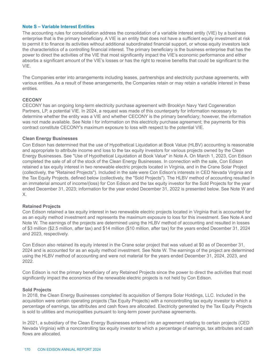 Note S – Variable Interest Entities The accounting rules for consolidation address the consolidation of a variable interest entity (VIE) by a business enterprise that is the primary beneficiary. A VIE is an entity that does not have a sufficient equity investment at risk to permit it to finance its activities without additional subordinated financial support, or whose equity investors lack the characteristics of a controlling financial interest. The primary beneficiary is the business enterprise that has the power to direct the activities of the VIE that most significantly impact the VIE’s economic performance and either absorbs a significant amount of the VIE’s losses or has the right to receive benefits that could be significant to the VIE. The Companies enter into arrangements including leases, partnerships and electricity purchase agreements, with various entities. As a result of these arrangements, the Companies retain or may retain a variable interest in these entities. CECONY CECONY has an ongoing long-term electricity purchase agreement with Brooklyn Navy Yard Cogeneration Partners, LP, a potential VIE. In 2024, a request was made of this counterparty for information necessary to determine whether the entity was a VIE and whether CECONY is the primary beneficiary; however, the information was not made available. See Note I for information on this electricity purchase agreement; the payments for this contract constitute CECONY's maximum exposure to loss with respect to the potential VIE. Clean Energy Businesses Con Edison has determined that the use of Hypothetical Liquidation at Book Value (HLBV) accounting is reasonable and appropriate to attribute income and loss to the tax equity investors for various projects owned by the Clean Energy Businesses. See "Use of Hypothetical Liquidation at Book Value" in Note A. On March 1, 2023, Con Edison completed the sale of all of the stock of the Clean Energy Businesses. In connection with the sale, Con Edison retained a tax equity interest in two renewable electric projects located in Virginia, and in the Crane Solar Project (collectively, the "Retained Projects"). Included in the sale were Con Edison's interests in CED Nevada Virginia and the Tax Equity Projects, defined below (collectively, the "Sold Projects"). The HLBV method of accounting resulted in an immaterial amount of income/(loss) for Con Edison and the tax equity investor for the Sold Projects for the year ended December 31, 2023; information for the year ended December 31, 2022 is presented below. See Note W and X. Retained Projects Con Edison retained a tax equity interest in two renewable electric projects located in Virginia that is accounted for as an equity method investment and represents the maximum exposure to loss for this investment. See Note A and Note W. The earnings of the projects are determined using the HLBV method of accounting and resulted in losses of $3 million ($2.5 million, after tax) and $14 million ($10 million, after tax) for the years ended December 31, 2024 and 2023, respectively. Con Edison also retained its equity interest in the Crane solar project that was valued at $0 as of December 31, 2024 and is accounted for as an equity method investment. See Note W. The earnings of the project are determined using the HLBV method of accounting and were not material for the years ended December 31, 2024, 2023, and 2022. Con Edison is not the primary beneficiary of any Retained Projects since the power to direct the activities that most significantly impact the economics of the renewable electric projects is not held by Con Edison. Sold Projects In 2018, the Clean Energy Businesses completed its acquisition of Sempra Solar Holdings, LLC. Included in the acquisition were certain operating projects (Tax Equity Projects) with a noncontrolling tax equity investor to which a percentage of earnings, tax attributes and cash flows are allocated. Electricity generated by the Tax Equity Projects is sold to utilities and municipalities pursuant to long-term power purchase agreements. In 2021, a subsidiary of the Clean Energy Businesses entered into an agreement relating to certain projects (CED Nevada Virginia) with a noncontrolling tax equity investor to which a percentage of earnings, tax attributes and cash flows are allocated. 170 CON EDISON ANNUAL REPORT 2024