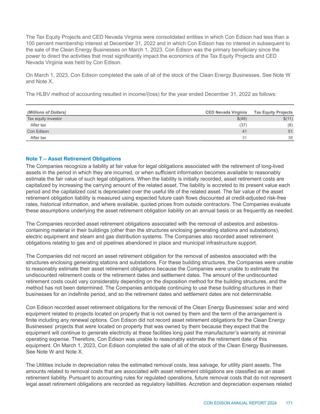 The Tax Equity Projects and CED Nevada Virginia were consolidated entities in which Con Edison had less than a 100 percent membership interest at December 31, 2022 and in which Con Edison has no interest in subsequent to the sale of the Clean Energy Businesses on March 1, 2023. Con Edison was the primary beneficiary since the power to direct the activities that most significantly impact the economics of the Tax Equity Projects and CED Nevada Virginia was held by Con Edison. On March 1, 2023, Con Edison completed the sale of all of the stock of the Clean Energy Businesses. See Note W and Note X. The HLBV method of accounting resulted in income/(loss) for the year ended December 31, 2022 as follows: (Millions of Dollars) CED Nevada Virginia Tax Equity Projects Tax equity investor $(49) $(11) After tax (37) (8) Con Edison 41 51 After tax 31 38 Note T – Asset Retirement Obligations The Companies recognize a liability at fair value for legal obligations associated with the retirement of long-lived assets in the period in which they are incurred, or when sufficient information becomes available to reasonably estimate the fair value of such legal obligations. When the liability is initially recorded, asset retirement costs are capitalized by increasing the carrying amount of the related asset. The liability is accreted to its present value each period and the capitalized cost is depreciated over the useful life of the related asset. The fair value of the asset retirement obligation liability is measured using expected future cash flows discounted at credit-adjusted risk-free rates, historical information, and where available, quoted prices from outside contractors. The Companies evaluate these assumptions underlying the asset retirement obligation liability on an annual basis or as frequently as needed. The Companies recorded asset retirement obligations associated with the removal of asbestos and asbestos- containing material in their buildings (other than the structures enclosing generating stations and substations), electric equipment and steam and gas distribution systems. The Companies also recorded asset retirement obligations relating to gas and oil pipelines abandoned in place and municipal infrastructure support. The Companies did not record an asset retirement obligation for the removal of asbestos associated with the structures enclosing generating stations and substations. For these building structures, the Companies were unable to reasonably estimate their asset retirement obligations because the Companies were unable to estimate the undiscounted retirement costs or the retirement dates and settlement dates. The amount of the undiscounted retirement costs could vary considerably depending on the disposition method for the building structures, and the method has not been determined. The Companies anticipate continuing to use these building structures in their businesses for an indefinite period, and so the retirement dates and settlement dates are not determinable. Con Edison recorded asset retirement obligations for the removal of the Clean Energy Businesses’ solar and wind equipment related to projects located on property that is not owned by them and the term of the arrangement is finite including any renewal options. Con Edison did not record asset retirement obligations for the Clean Energy Businesses’ projects that were located on property that was owned by them because they expect that the equipment will continue to generate electricity at these facilities long past the manufacturer’s warranty at minimal operating expense. Therefore, Con Edison was unable to reasonably estimate the retirement date of this equipment. On March 1, 2023, Con Edison completed the sale of all of the stock of the Clean Energy Businesses. See Note W and Note X. The Utilities include in depreciation rates the estimated removal costs, less salvage, for utility plant assets. The amounts related to removal costs that are associated with asset retirement obligations are classified as an asset retirement liability. Pursuant to accounting rules for regulated operations, future removal costs that do not represent legal asset retirement obligations are recorded as regulatory liabilities. Accretion and depreciation expenses related CON EDISON ANNUAL REPORT 2024 171
