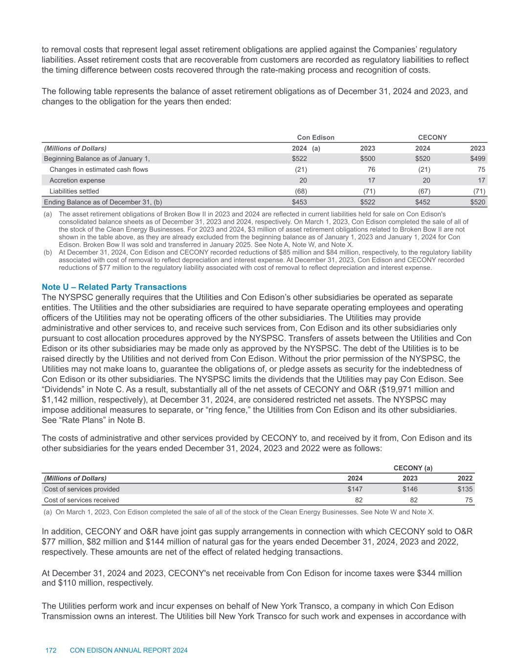 to removal costs that represent legal asset retirement obligations are applied against the Companies’ regulatory liabilities. Asset retirement costs that are recoverable from customers are recorded as regulatory liabilities to reflect the timing difference between costs recovered through the rate-making process and recognition of costs. The following table represents the balance of asset retirement obligations as of December 31, 2024 and 2023, and changes to the obligation for the years then ended: Con Edison CECONY (Millions of Dollars) 2024 (a) 2023 2024 2023 Beginning Balance as of January 1, $522 $500 $520 $499 Changes in estimated cash flows (21) 76 (21) 75 Accretion expense 20 17 20 17 Liabilities settled (68) (71) (67) (71) Ending Balance as of December 31, (b) $453 $522 $452 $520 (a) The asset retirement obligations of Broken Bow II in 2023 and 2024 are reflected in current liabilities held for sale on Con Edison's consolidated balance sheets as of December 31, 2023 and 2024, respectively. On March 1, 2023, Con Edison completed the sale of all of the stock of the Clean Energy Businesses. For 2023 and 2024, $3 million of asset retirement obligations related to Broken Bow II are not shown in the table above, as they are already excluded from the beginning balance as of January 1, 2023 and January 1, 2024 for Con Edison. Broken Bow II was sold and transferred in January 2025. See Note A, Note W, and Note X. (b) At December 31, 2024, Con Edison and CECONY recorded reductions of $85 million and $84 million, respectively, to the regulatory liability associated with cost of removal to reflect depreciation and interest expense. At December 31, 2023, Con Edison and CECONY recorded reductions of $77 million to the regulatory liability associated with cost of removal to reflect depreciation and interest expense. Note U – Related Party Transactions The NYSPSC generally requires that the Utilities and Con Edison’s other subsidiaries be operated as separate entities. The Utilities and the other subsidiaries are required to have separate operating employees and operating officers of the Utilities may not be operating officers of the other subsidiaries. The Utilities may provide administrative and other services to, and receive such services from, Con Edison and its other subsidiaries only pursuant to cost allocation procedures approved by the NYSPSC. Transfers of assets between the Utilities and Con Edison or its other subsidiaries may be made only as approved by the NYSPSC. The debt of the Utilities is to be raised directly by the Utilities and not derived from Con Edison. Without the prior permission of the NYSPSC, the Utilities may not make loans to, guarantee the obligations of, or pledge assets as security for the indebtedness of Con Edison or its other subsidiaries. The NYSPSC limits the dividends that the Utilities may pay Con Edison. See “Dividends” in Note C. As a result, substantially all of the net assets of CECONY and O&R ($19,971 million and $1,142 million, respectively), at December 31, 2024, are considered restricted net assets. The NYSPSC may impose additional measures to separate, or “ring fence,” the Utilities from Con Edison and its other subsidiaries. See “Rate Plans” in Note B. The costs of administrative and other services provided by CECONY to, and received by it from, Con Edison and its other subsidiaries for the years ended December 31, 2024, 2023 and 2022 were as follows: CECONY (a) (Millions of Dollars) 2024 2023 2022 Cost of services provided $147 $146 $135 Cost of services received 82 82 75 (a) On March 1, 2023, Con Edison completed the sale of all of the stock of the Clean Energy Businesses. See Note W and Note X. In addition, CECONY and O&R have joint gas supply arrangements in connection with which CECONY sold to O&R $77 million, $82 million and $144 million of natural gas for the years ended December 31, 2024, 2023 and 2022, respectively. These amounts are net of the effect of related hedging transactions. At December 31, 2024 and 2023, CECONY's net receivable from Con Edison for income taxes were $344 million and $110 million, respectively. The Utilities perform work and incur expenses on behalf of New York Transco, a company in which Con Edison Transmission owns an interest. The Utilities bill New York Transco for such work and expenses in accordance with 172 CON EDISON ANNUAL REPORT 2024