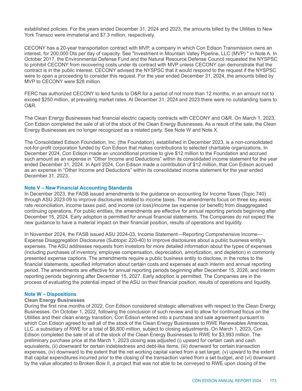 established policies. For the years ended December 31, 2024 and 2023, the amounts billed by the Utilities to New York Transco were immaterial and $7.3 million, respectively. CECONY has a 20-year transportation contract with MVP, a company in which Con Edison Transmission owns an interest, for 200,000 Dts per day of capacity. See "Investment in Mountain Valley Pipeline, LLC (MVP) " in Note A. In October 2017, the Environmental Defense Fund and the Natural Resource Defense Council requested the NYSPSC to prohibit CECONY from recovering costs under its contract with MVP unless CECONY can demonstrate that the contract is in the public interest. CECONY advised the NYSPSC that it would respond to the request if the NYSPSC were to open a proceeding to consider this request. For the year ended December 31, 2024, the amounts billed by MVP to CECONY were $28 million. FERC has authorized CECONY to lend funds to O&R for a period of not more than 12 months, in an amount not to exceed $250 million, at prevailing market rates. At December 31, 2024 and 2023 there were no outstanding loans to O&R. The Clean Energy Businesses had financial electric capacity contracts with CECONY and O&R. On March 1, 2023, Con Edison completed the sale of all of the stock of the Clean Energy Businesses. As a result of the sale, the Clean Energy Businesses are no longer recognized as a related party. See Note W and Note X. The Consolidated Edison Foundation, Inc. (the Foundation), established in December 2023, is a non-consolidated not-for-profit corporation funded by Con Edison that makes contributions to selected charitable organizations. In December 2024, Con Edison made an unconditional promise to give $12 million to the Foundation and accrued such amount as an expense in “Other Income and Deductions” within its consolidated income statement for the year ended December 31, 2024. In April 2024, Con Edison made a contribution of $12 million, that Con Edison accrued as an expense in “Other Income and Deductions” within its consolidated income statement for the year ended December 31, 2023. Note V – New Financial Accounting Standards In December 2023, the FASB issued amendments to the guidance on accounting for Income Taxes (Topic 740) through ASU 2023-09 to improve disclosures related to income taxes. The amendments focus on three key areas: rate reconciliation, income taxes paid, and income (or loss)/income tax expense (or benefit) from disaggregated continuing operations. For public entities, the amendments are effective for annual reporting periods beginning after December 15, 2024. Early adoption is permitted for annual financial statements. The Companies do not expect the new guidance to have a material impact on their financial position, results of operations and liquidity. In November 2024, the FASB issued ASU 2024-03, Income Statement—Reporting Comprehensive Income— Expense Disaggregation Disclosures (Subtopic 220-40) to improve disclosures about a public business entity's expenses. The ASU addresses requests from investors for more detailed information about the types of expenses (including purchases of inventory, employee compensation, depreciation, amortization, and depletion) in commonly presented expense captions. The amendments require a public business entity to disclose, in the notes to the financial statements, specified information about certain costs and expenses at each interim and annual reporting period. The amendments are effective for annual reporting periods beginning after December 15, 2026, and interim reporting periods beginning after December 15, 2027. Early adoption is permitted. The Companies are in the process of evaluating the potential impact of the ASU on their financial position, results of operations and liquidity. Note W – Dispositions Clean Energy Businesses During the first nine months of 2022, Con Edison considered strategic alternatives with respect to the Clean Energy Businesses. On October 1, 2022, following the conclusion of such review and to allow for continued focus on the Utilities and their clean energy transition, Con Edison entered into a purchase and sale agreement pursuant to which Con Edison agreed to sell all of the stock of the Clean Energy Businesses to RWE Renewables Americas, LLC, a subsidiary of RWE for a total of $6,800 million, subject to closing adjustments. On March 1, 2023, Con Edison completed the sale of all of the stock of the Clean Energy Businesses to RWE for $3,993 million. The preliminary purchase price at the March 1, 2023 closing was adjusted (i) upward for certain cash and cash equivalents, (ii) downward for certain indebtedness and debt-like items, (iii) downward for certain transaction expenses, (iv) downward to the extent that the net working capital varied from a set target, (v) upward to the extent that capital expenditures incurred prior to the closing of the transaction varied from a set budget, and (vi) downward by the value allocated to Broken Bow II, a project that was not able to be conveyed to RWE upon closing of the CON EDISON ANNUAL REPORT 2024 173