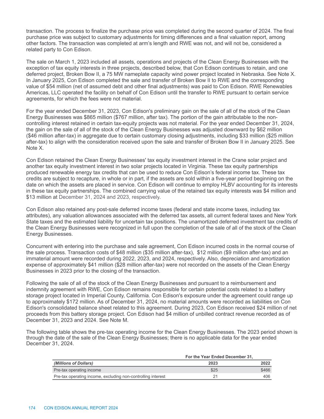transaction. The process to finalize the purchase price was completed during the second quarter of 2024. The final purchase price was subject to customary adjustments for timing differences and a final valuation report, among other factors. The transaction was completed at arm’s length and RWE was not, and will not be, considered a related party to Con Edison. The sale on March 1, 2023 included all assets, operations and projects of the Clean Energy Businesses with the exception of tax equity interests in three projects, described below, that Con Edison continues to retain, and one deferred project, Broken Bow II, a 75 MW nameplate capacity wind power project located in Nebraska. See Note X. In January 2025, Con Edison completed the sale and transfer of Broken Bow II to RWE and the corresponding value of $54 million (net of assumed debt and other final adjustments) was paid to Con Edison. RWE Renewables Americas, LLC operated the facility on behalf of Con Edison until the transfer to RWE pursuant to certain service agreements, for which the fees were not material. For the year ended December 31, 2023, Con Edison's preliminary gain on the sale of all of the stock of the Clean Energy Businesses was $865 million ($767 million, after tax). The portion of the gain attributable to the non- controlling interest retained in certain tax-equity projects was not material. For the year ended December 31, 2024, the gain on the sale of all of the stock of the Clean Energy Businesses was adjusted downward by $62 million ($46 million after-tax) in aggregate due to certain customary closing adjustments, including $33 million ($25 million after-tax) to align with the consideration received upon the sale and transfer of Broken Bow II in January 2025. See Note X. Con Edison retained the Clean Energy Businesses' tax equity investment interest in the Crane solar project and another tax equity investment interest in two solar projects located in Virginia. These tax equity partnerships produced renewable energy tax credits that can be used to reduce Con Edison’s federal income tax. These tax credits are subject to recapture, in whole or in part, if the assets are sold within a five-year period beginning on the date on which the assets are placed in service. Con Edison will continue to employ HLBV accounting for its interests in these tax equity partnerships. The combined carrying value of the retained tax equity interests was $4 million and $13 million at December 31, 2024 and 2023, respectively. Con Edison also retained any post-sale deferred income taxes (federal and state income taxes, including tax attributes), any valuation allowances associated with the deferred tax assets, all current federal taxes and New York State taxes and the estimated liability for uncertain tax positions. The unamortized deferred investment tax credits of the Clean Energy Businesses were recognized in full upon the completion of the sale of all of the stock of the Clean Energy Businesses. Concurrent with entering into the purchase and sale agreement, Con Edison incurred costs in the normal course of the sale process. Transaction costs of $48 million ($35 million after-tax), $12 million ($9 million after-tax) and an immaterial amount were recorded during 2022, 2023, and 2024, respectively. Also, depreciation and amortization expense of approximately $41 million ($28 million after-tax) were not recorded on the assets of the Clean Energy Businesses in 2023 prior to the closing of the transaction. Following the sale of all of the stock of the Clean Energy Businesses and pursuant to a reimbursement and indemnity agreement with RWE, Con Edison remains responsible for certain potential costs related to a battery storage project located in Imperial County, California. Con Edison's exposure under the agreement could range up to approximately $172 million. As of December 31, 2024, no material amounts were recorded as liabilities on Con Edison's consolidated balance sheet related to this agreement. During 2023, Con Edison received $24 million of net proceeds from this battery storage project. Con Edison had $4 million of unbilled contract revenue recorded as of December 31, 2023 and 2024. See Note M. The following table shows the pre-tax operating income for the Clean Energy Businesses. The 2023 period shown is through the date of the sale of the Clean Energy Businesses; there is no applicable data for the year ended December 31, 2024. For the Year Ended December 31, (Millions of Dollars) 2023 2022 Pre-tax operating income $25 $466 Pre-tax operating income, excluding non-controlling interest 21 406 174 CON EDISON ANNUAL REPORT 2024