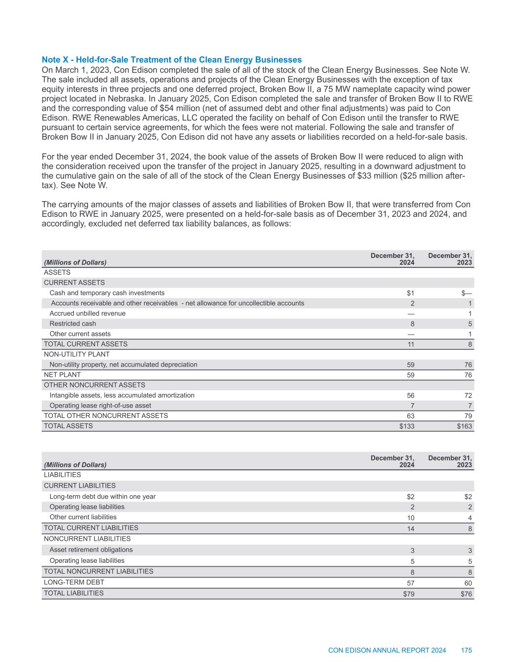Note X - Held-for-Sale Treatment of the Clean Energy Businesses On March 1, 2023, Con Edison completed the sale of all of the stock of the Clean Energy Businesses. See Note W. The sale included all assets, operations and projects of the Clean Energy Businesses with the exception of tax equity interests in three projects and one deferred project, Broken Bow II, a 75 MW nameplate capacity wind power project located in Nebraska. In January 2025, Con Edison completed the sale and transfer of Broken Bow II to RWE and the corresponding value of $54 million (net of assumed debt and other final adjustments) was paid to Con Edison. RWE Renewables Americas, LLC operated the facility on behalf of Con Edison until the transfer to RWE pursuant to certain service agreements, for which the fees were not material. Following the sale and transfer of Broken Bow II in January 2025, Con Edison did not have any assets or liabilities recorded on a held-for-sale basis. For the year ended December 31, 2024, the book value of the assets of Broken Bow II were reduced to align with the consideration received upon the transfer of the project in January 2025, resulting in a downward adjustment to the cumulative gain on the sale of all of the stock of the Clean Energy Businesses of $33 million ($25 million after- tax). See Note W. The carrying amounts of the major classes of assets and liabilities of Broken Bow II, that were transferred from Con Edison to RWE in January 2025, were presented on a held-for-sale basis as of December 31, 2023 and 2024, and accordingly, excluded net deferred tax liability balances, as follows: (Millions of Dollars) December 31, 2024 December 31, 2023 ASSETS CURRENT ASSETS Cash and temporary cash investments $1 $— Accounts receivable and other receivables - net allowance for uncollectible accounts 2 1 Accrued unbilled revenue — 1 Restricted cash 8 5 Other current assets — 1 TOTAL CURRENT ASSETS 11 8 NON-UTILITY PLANT Non-utility property, net accumulated depreciation 59 76 NET PLANT 59 76 OTHER NONCURRENT ASSETS Intangible assets, less accumulated amortization 56 72 Operating lease right-of-use asset 7 7 TOTAL OTHER NONCURRENT ASSETS 63 79 TOTAL ASSETS $133 $163 (Millions of Dollars) December 31, 2024 December 31, 2023 LIABILITIES CURRENT LIABILITIES Long-term debt due within one year $2 $2 Operating lease liabilities 2 2 Other current liabilities 10 4 TOTAL CURRENT LIABILITIES 14 8 NONCURRENT LIABILITIES Asset retirement obligations 3 3 Operating lease liabilities 5 5 TOTAL NONCURRENT LIABILITIES 8 8 LONG-TERM DEBT 57 60 TOTAL LIABILITIES $79 $76 CON EDISON ANNUAL REPORT 2024 175