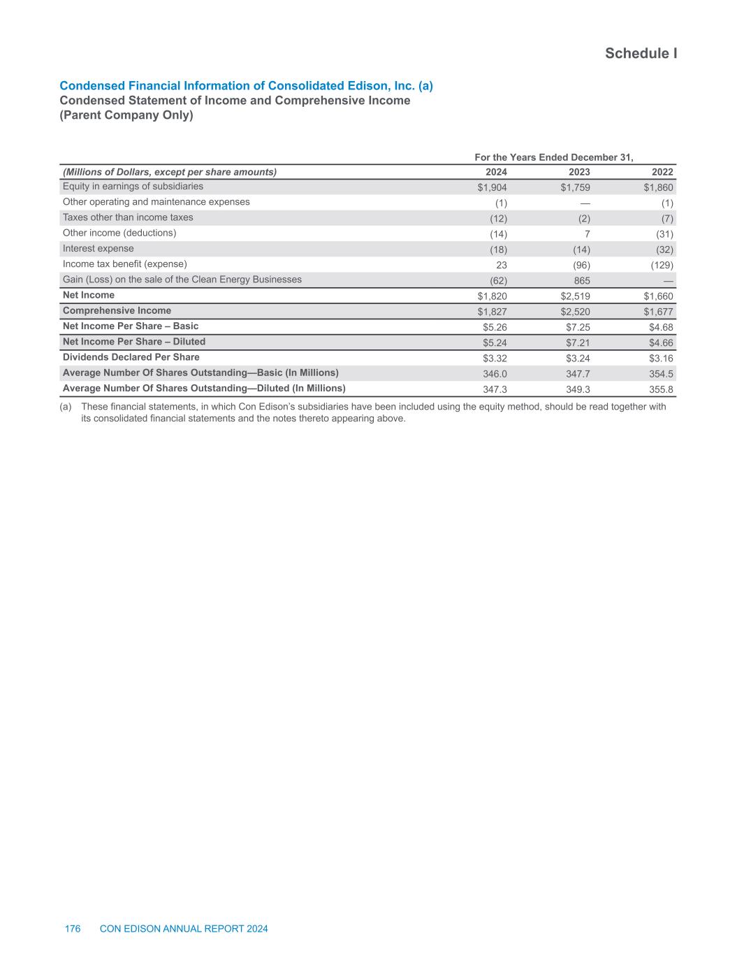 Schedule I Condensed Financial Information of Consolidated Edison, Inc. (a) Condensed Statement of Income and Comprehensive Income (Parent Company Only) For the Years Ended December 31, (Millions of Dollars, except per share amounts) 2024 2023 2022 Equity in earnings of subsidiaries $1,904 $1,759 $1,860 Other operating and maintenance expenses (1) — (1) Taxes other than income taxes (12) (2) (7) Other income (deductions) (14) 7 (31) Interest expense (18) (14) (32) Income tax benefit (expense) 23 (96) (129) Gain (Loss) on the sale of the Clean Energy Businesses (62) 865 — Net Income $1,820 $2,519 $1,660 Comprehensive Income $1,827 $2,520 $1,677 Net Income Per Share – Basic $5.26 $7.25 $4.68 Net Income Per Share – Diluted $5.24 $7.21 $4.66 Dividends Declared Per Share $3.32 $3.24 $3.16 Average Number Of Shares Outstanding—Basic (In Millions) 346.0 347.7 354.5 Average Number Of Shares Outstanding—Diluted (In Millions) 347.3 349.3 355.8 (a) These financial statements, in which Con Edison’s subsidiaries have been included using the equity method, should be read together with its consolidated financial statements and the notes thereto appearing above. 176 CON EDISON ANNUAL REPORT 2024