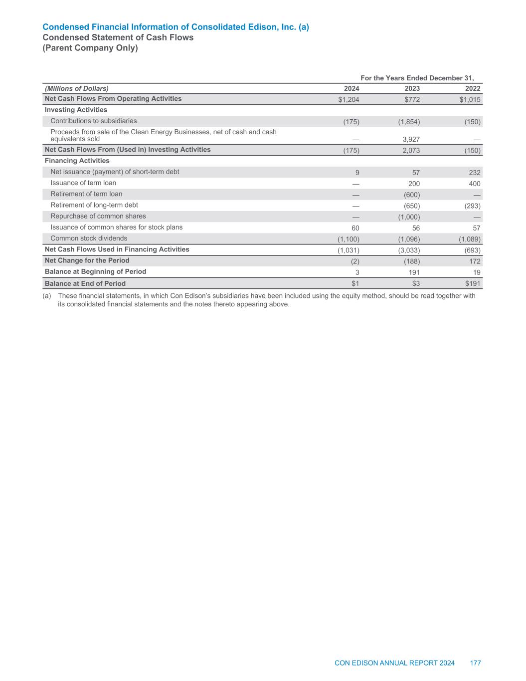 Condensed Financial Information of Consolidated Edison, Inc. (a) Condensed Statement of Cash Flows (Parent Company Only) For the Years Ended December 31, (Millions of Dollars) 2024 2023 2022 Net Cash Flows From Operating Activities $1,204 $772 $1,015 Investing Activities Contributions to subsidiaries (175) (1,854) (150) Proceeds from sale of the Clean Energy Businesses, net of cash and cash equivalents sold — 3,927 — Net Cash Flows From (Used in) Investing Activities (175) 2,073 (150) Financing Activities Net issuance (payment) of short-term debt 9 57 232 Issuance of term loan — 200 400 Retirement of term loan — (600) — Retirement of long-term debt — (650) (293) Repurchase of common shares — (1,000) — Issuance of common shares for stock plans 60 56 57 Common stock dividends (1,100) (1,096) (1,089) Net Cash Flows Used in Financing Activities (1,031) (3,033) (693) Net Change for the Period (2) (188) 172 Balance at Beginning of Period 3 191 19 Balance at End of Period $1 $3 $191 (a) These financial statements, in which Con Edison’s subsidiaries have been included using the equity method, should be read together with its consolidated financial statements and the notes thereto appearing above. CON EDISON ANNUAL REPORT 2024 177