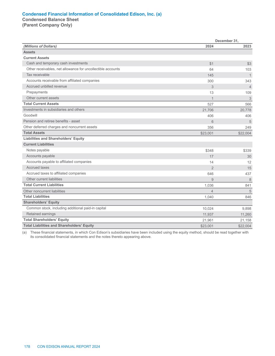 Condensed Financial Information of Consolidated Edison, Inc. (a) Condensed Balance Sheet (Parent Company Only) December 31, (Millions of Dollars) 2024 2023 Assets Current Assets Cash and temporary cash investments $1 $3 Other receivables, net allowance for uncollectible accounts 64 103 Tax receivable 145 1 Accounts receivable from affiliated companies 300 343 Accrued unbilled revenue 3 4 Prepayments 13 109 Other current assets 1 3 Total Current Assets 527 566 Investments in subsidiaries and others 21,706 20,778 Goodwill 406 406 Pension and retiree benefits - asset 6 5 Other deferred charges and noncurrent assets 356 249 Total Assets $23,001 $22,004 Liabilities and Shareholders’ Equity Current Liabilities Notes payable $348 $339 Accounts payable 17 30 Accounts payable to affiliated companies 14 12 Accrued taxes 2 15 Accrued taxes to affiliated companies 646 437 Other current liabilities 9 8 Total Current Liabilities 1,036 841 Other noncurrent liabilities 4 5 Total Liabilities 1,040 846 Shareholders’ Equity Common stock, including additional paid-in capital 10,024 9,898 Retained earnings 11,937 11,260 Total Shareholders’ Equity 21,961 21,158 Total Liabilities and Shareholders’ Equity $23,001 $22,004 (a) These financial statements, in which Con Edison’s subsidiaries have been included using the equity method, should be read together with its consolidated financial statements and the notes thereto appearing above. 178 CON EDISON ANNUAL REPORT 2024