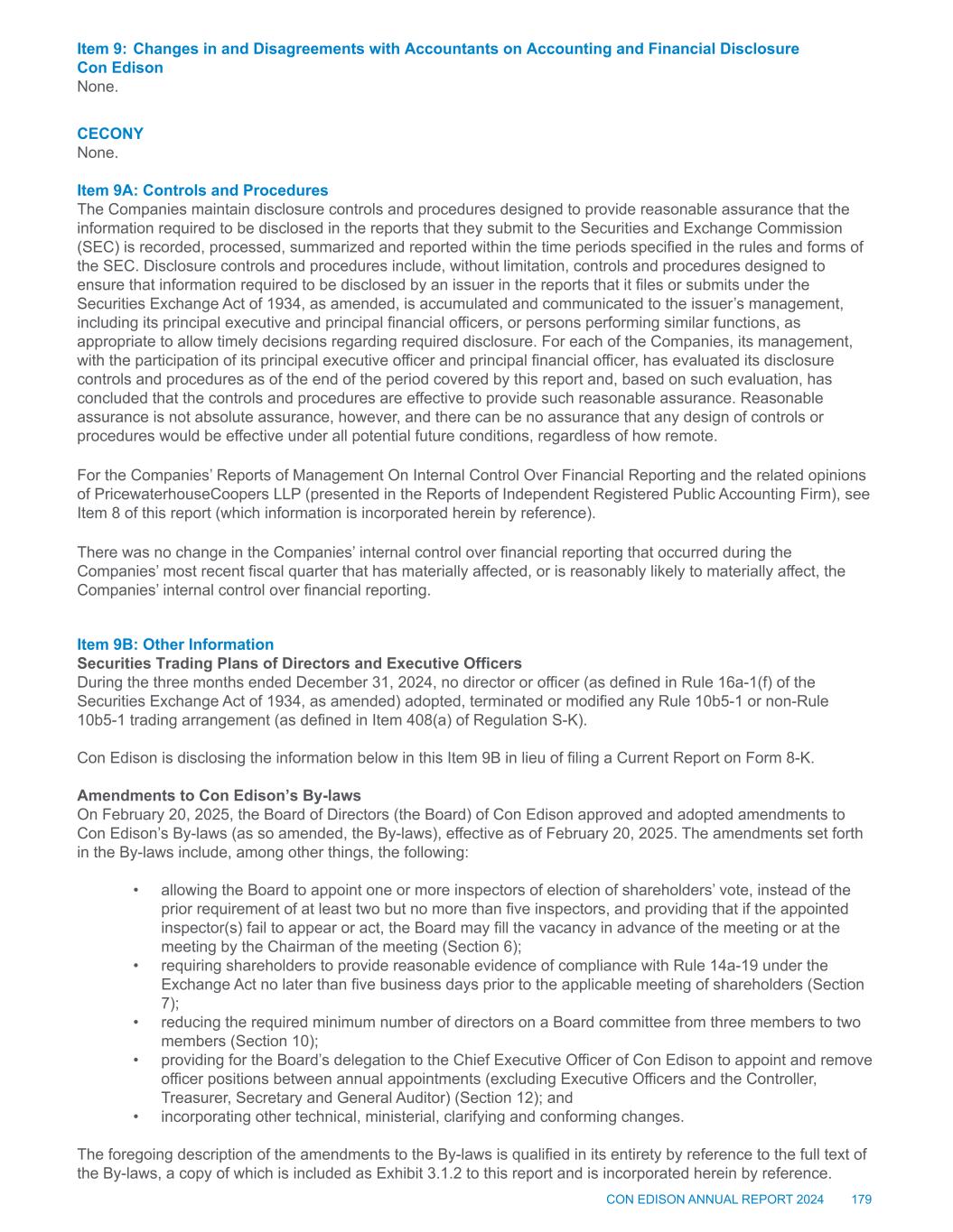 Item 9: Changes in and Disagreements with Accountants on Accounting and Financial Disclosure Con Edison None. CECONY None. Item 9A: Controls and Procedures The Companies maintain disclosure controls and procedures designed to provide reasonable assurance that the information required to be disclosed in the reports that they submit to the Securities and Exchange Commission (SEC) is recorded, processed, summarized and reported within the time periods specified in the rules and forms of the SEC. Disclosure controls and procedures include, without limitation, controls and procedures designed to ensure that information required to be disclosed by an issuer in the reports that it files or submits under the Securities Exchange Act of 1934, as amended, is accumulated and communicated to the issuer’s management, including its principal executive and principal financial officers, or persons performing similar functions, as appropriate to allow timely decisions regarding required disclosure. For each of the Companies, its management, with the participation of its principal executive officer and principal financial officer, has evaluated its disclosure controls and procedures as of the end of the period covered by this report and, based on such evaluation, has concluded that the controls and procedures are effective to provide such reasonable assurance. Reasonable assurance is not absolute assurance, however, and there can be no assurance that any design of controls or procedures would be effective under all potential future conditions, regardless of how remote. For the Companies’ Reports of Management On Internal Control Over Financial Reporting and the related opinions of PricewaterhouseCoopers LLP (presented in the Reports of Independent Registered Public Accounting Firm), see Item 8 of this report (which information is incorporated herein by reference). There was no change in the Companies’ internal control over financial reporting that occurred during the Companies’ most recent fiscal quarter that has materially affected, or is reasonably likely to materially affect, the Companies’ internal control over financial reporting. Item 9B: Other Information Securities Trading Plans of Directors and Executive Officers During the three months ended December 31, 2024, no director or officer (as defined in Rule 16a-1(f) of the Securities Exchange Act of 1934, as amended) adopted, terminated or modified any Rule 10b5-1 or non-Rule 10b5-1 trading arrangement (as defined in Item 408(a) of Regulation S-K). Con Edison is disclosing the information below in this Item 9B in lieu of filing a Current Report on Form 8-K. Amendments to Con Edison’s By-laws On February 20, 2025, the Board of Directors (the Board) of Con Edison approved and adopted amendments to Con Edison’s By-laws (as so amended, the By-laws), effective as of February 20, 2025. The amendments set forth in the By-laws include, among other things, the following: • allowing the Board to appoint one or more inspectors of election of shareholders’ vote, instead of the prior requirement of at least two but no more than five inspectors, and providing that if the appointed inspector(s) fail to appear or act, the Board may fill the vacancy in advance of the meeting or at the meeting by the Chairman of the meeting (Section 6); • requiring shareholders to provide reasonable evidence of compliance with Rule 14a-19 under the Exchange Act no later than five business days prior to the applicable meeting of shareholders (Section 7); • reducing the required minimum number of directors on a Board committee from three members to two members (Section 10); • providing for the Board’s delegation to the Chief Executive Officer of Con Edison to appoint and remove officer positions between annual appointments (excluding Executive Officers and the Controller, Treasurer, Secretary and General Auditor) (Section 12); and • incorporating other technical, ministerial, clarifying and conforming changes. The foregoing description of the amendments to the By-laws is qualified in its entirety by reference to the full text of the By-laws, a copy of which is included as Exhibit 3.1.2 to this report and is incorporated herein by reference. CON EDISON ANNUAL REPORT 2024 179