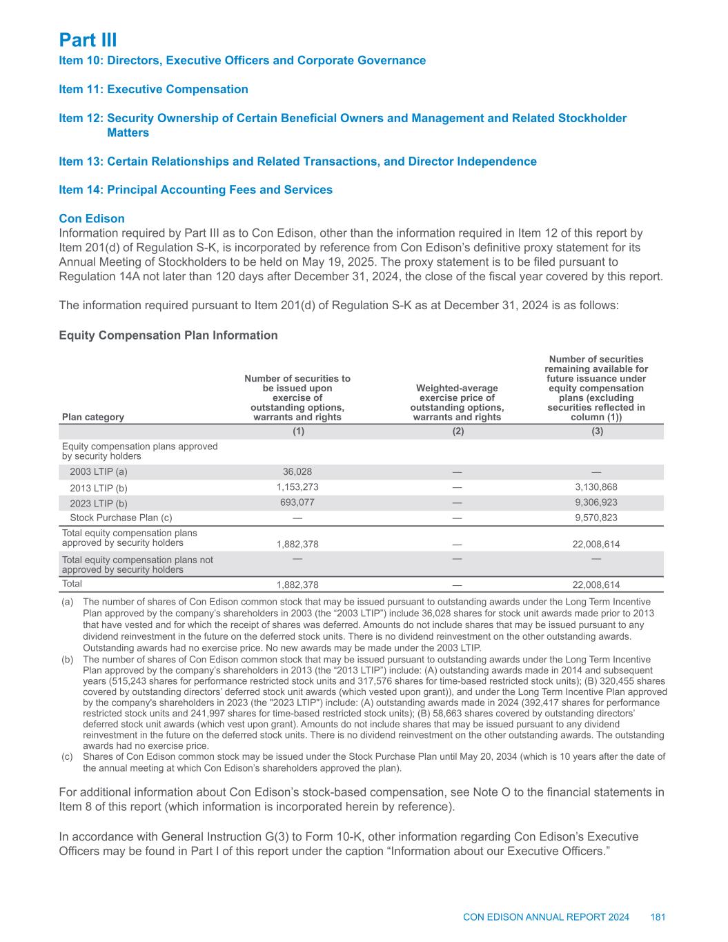 Part III Item 10: Directors, Executive Officers and Corporate Governance Item 11: Executive Compensation Item 12: Security Ownership of Certain Beneficial Owners and Management and Related Stockholder Matters Item 13: Certain Relationships and Related Transactions, and Director Independence Item 14: Principal Accounting Fees and Services Con Edison Information required by Part III as to Con Edison, other than the information required in Item 12 of this report by Item 201(d) of Regulation S-K, is incorporated by reference from Con Edison’s definitive proxy statement for its Annual Meeting of Stockholders to be held on May 19, 2025. The proxy statement is to be filed pursuant to Regulation 14A not later than 120 days after December 31, 2024, the close of the fiscal year covered by this report. The information required pursuant to Item 201(d) of Regulation S-K as at December 31, 2024 is as follows: Equity Compensation Plan Information Plan category Number of securities to be issued upon exercise of outstanding options, warrants and rights Weighted-average exercise price of outstanding options, warrants and rights Number of securities remaining available for future issuance under equity compensation plans (excluding securities reflected in column (1)) (1) (2) (3) Equity compensation plans approved by security holders 2003 LTIP (a) 36,028 — — 2013 LTIP (b) 1,153,273 — 3,130,868 2023 LTIP (b) 693,077 — 9,306,923 Stock Purchase Plan (c) — — 9,570,823 Total equity compensation plans approved by security holders 1,882,378 — 22,008,614 Total equity compensation plans not approved by security holders — — — Total 1,882,378 — 22,008,614 (a) The number of shares of Con Edison common stock that may be issued pursuant to outstanding awards under the Long Term Incentive Plan approved by the company’s shareholders in 2003 (the “2003 LTIP”) include 36,028 shares for stock unit awards made prior to 2013 that have vested and for which the receipt of shares was deferred. Amounts do not include shares that may be issued pursuant to any dividend reinvestment in the future on the deferred stock units. There is no dividend reinvestment on the other outstanding awards. Outstanding awards had no exercise price. No new awards may be made under the 2003 LTIP. (b) The number of shares of Con Edison common stock that may be issued pursuant to outstanding awards under the Long Term Incentive Plan approved by the company’s shareholders in 2013 (the “2013 LTIP”) include: (A) outstanding awards made in 2014 and subsequent years (515,243 shares for performance restricted stock units and 317,576 shares for time-based restricted stock units); (B) 320,455 shares covered by outstanding directors’ deferred stock unit awards (which vested upon grant)), and under the Long Term Incentive Plan approved by the company's shareholders in 2023 (the "2023 LTIP") include: (A) outstanding awards made in 2024 (392,417 shares for performance restricted stock units and 241,997 shares for time-based restricted stock units); (B) 58,663 shares covered by outstanding directors’ deferred stock unit awards (which vest upon grant). Amounts do not include shares that may be issued pursuant to any dividend reinvestment in the future on the deferred stock units. There is no dividend reinvestment on the other outstanding awards. The outstanding awards had no exercise price. (c) Shares of Con Edison common stock may be issued under the Stock Purchase Plan until May 20, 2034 (which is 10 years after the date of the annual meeting at which Con Edison’s shareholders approved the plan). For additional information about Con Edison’s stock-based compensation, see Note O to the financial statements in Item 8 of this report (which information is incorporated herein by reference). In accordance with General Instruction G(3) to Form 10-K, other information regarding Con Edison’s Executive Officers may be found in Part I of this report under the caption “Information about our Executive Officers.” CON EDISON ANNUAL REPORT 2024 181