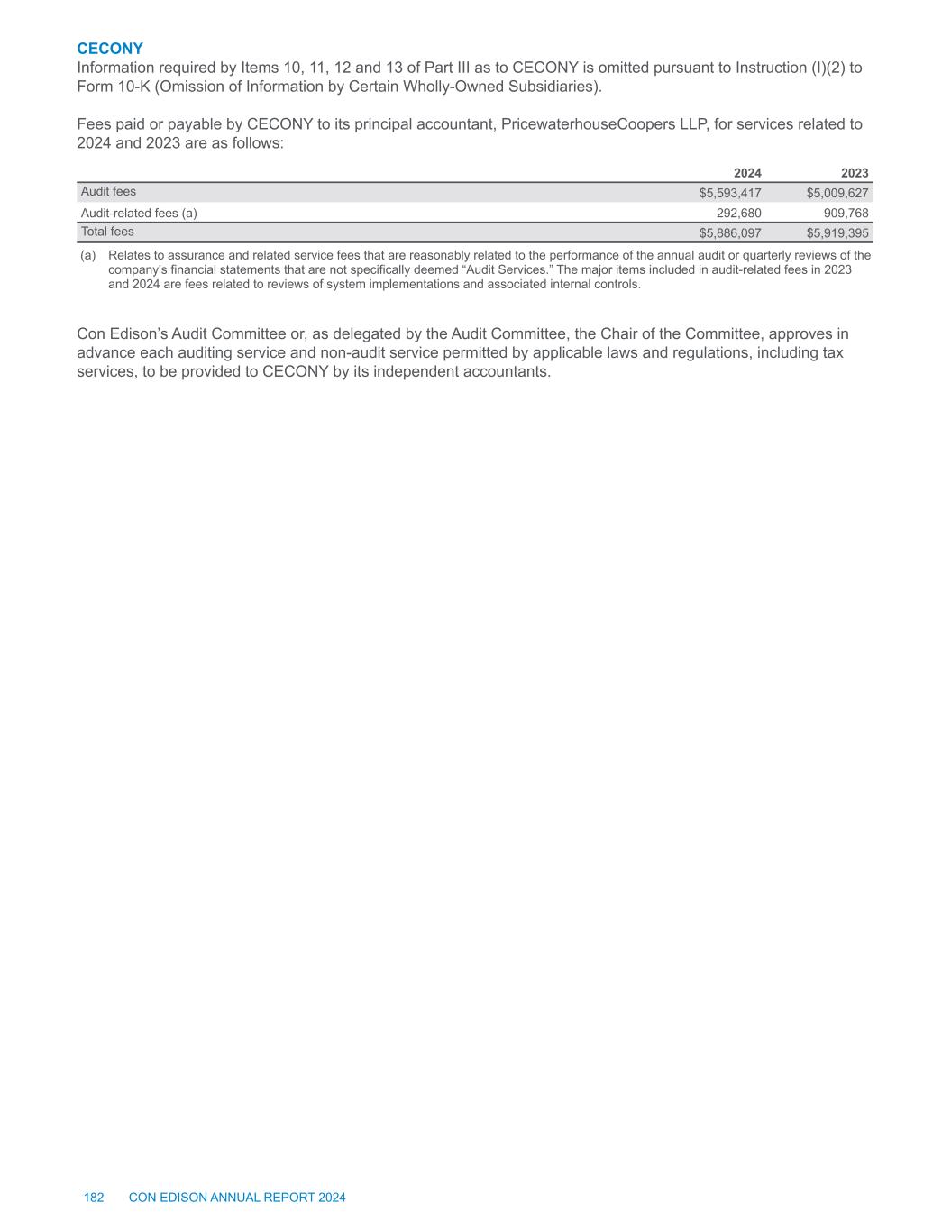 CECONY Information required by Items 10, 11, 12 and 13 of Part III as to CECONY is omitted pursuant to Instruction (I)(2) to Form 10-K (Omission of Information by Certain Wholly-Owned Subsidiaries). Fees paid or payable by CECONY to its principal accountant, PricewaterhouseCoopers LLP, for services related to 2024 and 2023 are as follows: 2024 2023 Audit fees $5,593,417 $5,009,627 Audit-related fees (a) 292,680 909,768 Total fees $5,886,097 $5,919,395 (a) Relates to assurance and related service fees that are reasonably related to the performance of the annual audit or quarterly reviews of the company's financial statements that are not specifically deemed “Audit Services.” The major items included in audit-related fees in 2023 and 2024 are fees related to reviews of system implementations and associated internal controls. Con Edison’s Audit Committee or, as delegated by the Audit Committee, the Chair of the Committee, approves in advance each auditing service and non-audit service permitted by applicable laws and regulations, including tax services, to be provided to CECONY by its independent accountants. 182 CON EDISON ANNUAL REPORT 2024
