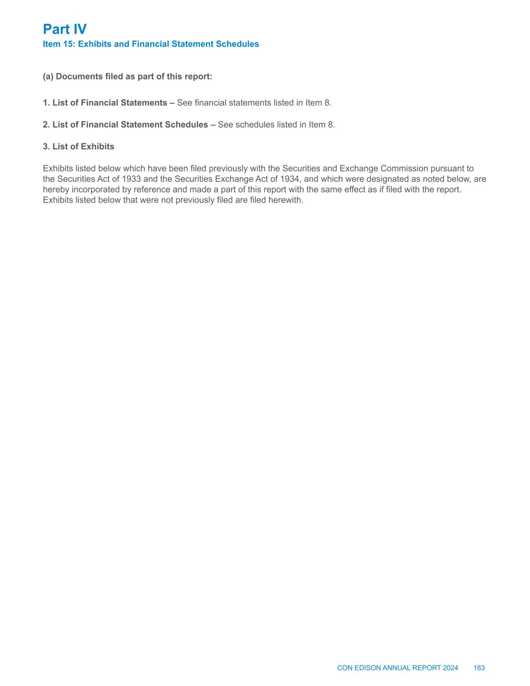 Part IV Item 15: Exhibits and Financial Statement Schedules (a) Documents filed as part of this report: 1. List of Financial Statements – See financial statements listed in Item 8. 2. List of Financial Statement Schedules – See schedules listed in Item 8. 3. List of Exhibits Exhibits listed below which have been filed previously with the Securities and Exchange Commission pursuant to the Securities Act of 1933 and the Securities Exchange Act of 1934, and which were designated as noted below, are hereby incorporated by reference and made a part of this report with the same effect as if filed with the report. Exhibits listed below that were not previously filed are filed herewith. CON EDISON ANNUAL REPORT 2024 183