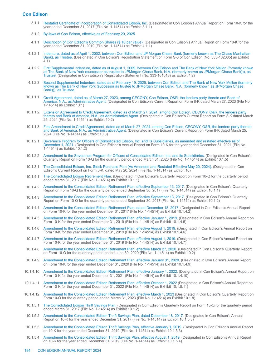 Con Edison 3.1.1 Restated Certificate of Incorporation of Consolidated Edison, Inc. (Designated in Con Edison’s Annual Report on Form 10-K for the year ended December 31, 2017 (File No. 1-14514) as Exhibit 3.1.1) 3.1.2 By-laws of Con Edison, effective as of February 20, 2025. 4.1.1 Description of Con Edison's Common Shares ($.10 par value). (Designated in Con Edison’s Annual Report on Form 10-K for the year ended December 31, 2019 (File No. 1-14514) as Exhibit 4.1.1) 4.1.2.1 Indenture, dated as of April 1, 2002, between Con Edison and JP Morgan Chase Bank (formerly known as The Chase Manhattan Bank), as Trustee. (Designated in Con Edison's Registration Statement on Form S-3 of Con Edison (No. 333-102005) as Exhibit 4.1) 4.1.2.2 First Supplemental Indenture, dated as of August 1, 2009, between Con Edison and The Bank of New York Mellon (formerly known as The Bank of New York (successor as trustee to JPMorgan Chase Bank, N.A. (formerly known as JPMorgan Chase Bank))), as Trustee. (Designated in Con Edison’s Registration Statement (No. 333-161018) as Exhibit 4.2) 4.1.2.3 Second Supplemental Indenture, dated as of February 19, 2025, between Con Edison and The Bank of New York Mellon (formerly known as The Bank of New York (successor as trustee to JPMorgan Chase Bank, N.A. (formerly known as JPMorgan Chase Bank))), as Trustee. 10.1.1.1 Credit Agreement, dated as of March 27, 2023, among CECONY, Con Edison, O&R, the lenders party thereto and Bank of America, N.A., as Administrative Agent. (Designated in Con Edison’s Current Report on Form 8-K dated March 27, 2023 (File No. 1-14514) as Exhibit 10.1) 10.1.1.2 Extension Agreement to Credit Agreement, dated as of March 27, 2024, among Con Edison, CECONY, O&R, the lenders party thereto and Bank of America, N.A., as Administrative Agent. (Designated in Con Edison’s Current Report on Form 8-K dated March 25, 2024 (File No. 1-14514) as Exhibit 10.2) 10.1.1.3 First Amendment to Credit Agreement, dated as of March 27, 2024, among Con Edison, CECONY, O&R, the lenders party thereto and Bank of America, N.A., as Administrative Agent. (Designated in Con Edison’s Current Report on Form 8-K dated March 25, 2024 (File No. 1-14514) as Exhibit 10.3) 10.1.2.1 Severance Program for Officers of Consolidated Edison, Inc. and its Subsidiaries, as amended and restated effective as of December 1, 2021. (Designated in Con Edison's Annual Report on Form 10-K for the year ended December 31, 2021 (File No. 1-14514) as Exhibit 10.1.2) 10.1.2.2 Amendment to the Severance Program for Officers of Consolidated Edison, Inc. and its Subsidiaries. (Designated in Con Edison's Quarterly Report on Form 10-Q for the quarterly period ended March 31, 2023 (File No. 1-14514) as Exhibit 10.1.5) 10.1.3.1 The Consolidated Edison, Inc. Stock Purchase Plan (As Amended and Restated Effective May 20, 2024). (Designated in Con Edison's Current Report on Form 8-K, dated May 20, 2024 (File No. 1-14514) as Exhibit 10) 10.1.4.1 The Consolidated Edison Retirement Plan. (Designated in Con Edison’s Quarterly Report on Form 10-Q for the quarterly period ended March 31, 2017 (File No. 1-14514) as Exhibit 10.1.1) 10.1.4.2 Amendment to the Consolidated Edison Retirement Plan, effective September 13, 2017. (Designated in Con Edison’s Quarterly Report on Form 10-Q for the quarterly period ended September 30, 2017 (File No. 1-14514) as Exhibit 10.1.1) 10.1.4.3 Amendment to the Consolidated Edison Retirement Plan, effective September 13, 2017. (Designated in Con Edison’s Quarterly Report on Form 10-Q for the quarterly period ended September 30, 2017 (File No. 1-14514) as Exhibit 10.1.2) 10.1.4.4 Amendment to the Consolidated Edison Retirement Plan, dated December 18, 2017. (Designated in Con Edison’s Annual Report on Form 10-K for the year ended December 31, 2017 (File No. 1-14514) as Exhibit 10.1.4.2) 10.1.4.5 Amendment to the Consolidated Edison Retirement Plan, effective January 1, 2019. (Designated in Con Edison’s Annual Report on Form 10-K for the year ended December 31, 2019 (File No. 1-14514) as Exhibit 10.1.4.5) 10.1.4.6 Amendment to the Consolidated Edison Retirement Plan, effective August 1, 2019. (Designated in Con Edison’s Annual Report on Form 10-K for the year ended December 31, 2019 (File No. 1-14514) as Exhibit 10.1.4.6) 10.1.4.7 Amendment to the Consolidated Edison Retirement Plan, effective August 1, 2019. (Designated in Con Edison’s Annual Report on Form 10-K for the year ended December 31, 2019 (File No. 1-14514) as Exhibit 10.1.4.7) 10.1.4.8 Amendment to the Consolidated Edison Retirement Plan, effective March 27, 2020. (Designated in Con Edison’s Quarterly Report on Form 10-Q for the quarterly period ended June 30, 2020 (File No. 1-14514) as Exhibit 10.2) 10.1.4.9 Amendment to the Consolidated Edison Retirement Plan, effective January 31, 2020. (Designated in Con Edison's Annual Report on Form 10-K for the year ended December 31, 2020 (File No. 1-14514) as Exhibit 10.1.4.9) 10.1.4.10 Amendment to the Consolidated Edison Retirement Plan, effective January 1, 2022. (Designated in Con Edison's Annual Report on Form 10-K for the year ended December 31, 2021 (File No. 1-14514) as Exhibit 10.1.4.10) 10.1.4.11 Amendment to the Consolidated Edison Retirement Plan, effective October 1, 2022 (Designated in Con Edison's Annual Report on Form 10-K for the year ended December 31, 2022 (File No. 1-14514) as Exhibit 10.1.5.11) 10.1.4.12 Amendment to the Consolidated Edison Retirement Plan, effective March 1, 2023 (Designated in Con Edison's Quarterly Report on Form 10-Q for the quarterly period ended March 31, 2023 (File No. 1-14514) as Exhibit 10.1.8) 10.1.5.1 The Consolidated Edison Thrift Savings Plan. (Designated in Con Edison’s Quarterly Report on Form 10-Q for the quarterly period ended March 31, 2017 (File No. 1-14514) as Exhibit 10.1.2) 10.1.5.2 Amendment to the Consolidated Edison Thrift Savings Plan, dated December 18, 2017. (Designated in Con Edison's Annual Repo