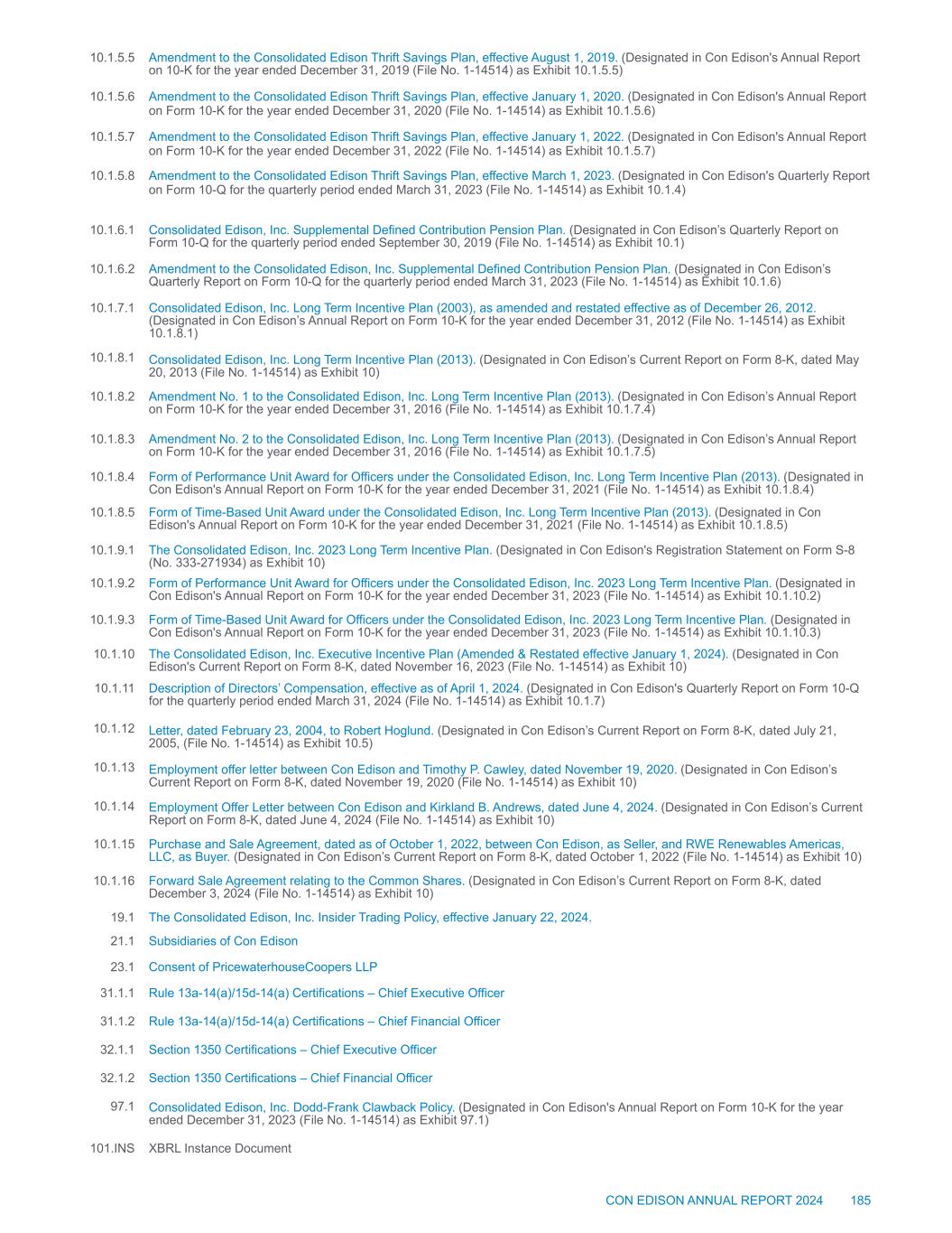 10.1.5.5 Amendment to the Consolidated Edison Thrift Savings Plan, effective August 1, 2019. (Designated in Con Edison's Annual Report on 10-K for the year ended December 31, 2019 (File No. 1-14514) as Exhibit 10.1.5.5) 10.1.5.6 Amendment to the Consolidated Edison Thrift Savings Plan, effective January 1, 2020. (Designated in Con Edison's Annual Report on Form 10-K for the year ended December 31, 2020 (File No. 1-14514) as Exhibit 10.1.5.6) 10.1.5.7 Amendment to the Consolidated Edison Thrift Savings Plan, effective January 1, 2022. (Designated in Con Edison's Annual Report on Form 10-K for the year ended December 31, 2022 (File No. 1-14514) as Exhibit 10.1.5.7) 10.1.5.8 Amendment to the Consolidated Edison Thrift Savings Plan, effective March 1, 2023. (Designated in Con Edison's Quarterly Report on Form 10-Q for the quarterly period ended March 31, 2023 (File No. 1-14514) as Exhibit 10.1.4) 10.1.6.1 Consolidated Edison, Inc. Supplemental Defined Contribution Pension Plan. (Designated in Con Edison’s Quarterly Report on Form 10-Q for the quarterly period ended September 30, 2019 (File No. 1-14514) as Exhibit 10.1) 10.1.6.2 Amendment to the Consolidated Edison, Inc. Supplemental Defined Contribution Pension Plan. (Designated in Con Edison’s Quarterly Report on Form 10-Q for the quarterly period ended March 31, 2023 (File No. 1-14514) as Exhibit 10.1.6) 10.1.7.1 Consolidated Edison, Inc. Long Term Incentive Plan (2003), as amended and restated effective as of December 26, 2012. (Designated in Con Edison’s Annual Report on Form 10-K for the year ended December 31, 2012 (File No. 1-14514) as Exhibit 10.1.8.1) 10.1.8.1 Consolidated Edison, Inc. Long Term Incentive Plan (2013). (Designated in Con Edison’s Current Report on Form 8-K, dated May 20, 2013 (File No. 1-14514) as Exhibit 10) 10.1.8.2 Amendment No. 1 to the Consolidated Edison, Inc. Long Term Incentive Plan (2013). (Designated in Con Edison’s Annual Report on Form 10-K for the year ended December 31, 2016 (File No. 1-14514) as Exhibit 10.1.7.4) 10.1.8.3 Amendment No. 2 to the Consolidated Edison, Inc. Long Term Incentive Plan (2013). (Designated in Con Edison’s Annual Report on Form 10-K for the year ended December 31, 2016 (File No. 1-14514) as Exhibit 10.1.7.5) 10.1.8.4 Form of Performance Unit Award for Officers under the Consolidated Edison, Inc. Long Term Incentive Plan (2013). (Designated in Con Edison's Annual Report on Form 10-K for the year ended December 31, 2021 (File No. 1-14514) as Exhibit 10.1.8.4) 10.1.8.5 Form of Time-Based Unit Award under the Consolidated Edison, Inc. Long Term Incentive Plan (2013). (Designated in Con Edison's Annual Report on Form 10-K for the year ended December 31, 2021 (File No. 1-14514) as Exhibit 10.1.8.5) 10.1.9.1 The Consolidated Edison, Inc. 2023 Long Term Incentive Plan. (Designated in Con Edison's Registration Statement on Form S-8 (No. 333-271934) as Exhibit 10) 10.1.9.2 Form of Performance Unit Award for Officers under the Consolidated Edison, Inc. 2023 Long Term Incentive Plan. (Designated in Con Edison's Annual Report on Form 10-K for the year ended December 31, 2023 (File No. 1-14514) as Exhibit 10.1.10.2) 10.1.9.3 Form of Time-Based Unit Award for Officers under the Consolidated Edison, Inc. 2023 Long Term Incentive Plan. (Designated in Con Edison's Annual Report on Form 10-K for the year ended December 31, 2023 (File No. 1-14514) as Exhibit 10.1.10.3) 10.1.10 The Consolidated Edison, Inc. Executive Incentive Plan (Amended & Restated effective January 1, 2024). (Designated in Con Edison's Current Report on Form 8-K, dated November 16, 2023 (File No. 1-14514) as Exhibit 10) 10.1.11 Description of Directors’ Compensation, effective as of April 1, 2024. (Designated in Con Edison's Quarterly Report on Form 10-Q for the quarterly period ended March 31, 2024 (File No. 1-14514) as Exhibit 10.1.7) 10.1.12 Letter, dated February 23, 2004, to Robert Hoglund. (Designated in Con Edison’s Current Report on Form 8-K, dated July 21, 2005, (File No. 1-14514) as Exhibit 10.5) 10.1.13 Employment offer letter between Con Edison and Timothy P. Cawley, dated November 19, 2020. (Designated in Con Edison’s Current Report on Form 8-K, dated November 19, 2020 (File No. 1-14514) as Exhibit 10) 10.1.14 Employment Offer Letter between Con Edison and Kirkland B. Andrews, dated June 4, 2024. (Designated in Con Edison’s Current Report on Form 8-K, dated June 4, 2024 (File No. 1-14514) as Exhibit 10) 10.1.15 Purchase and Sale Agreement, dated as of October 1, 2022, between Con Edison, as Seller, and RWE Renewables Americas, LLC, as Buyer. (Designated in Con Edison’s Current Report on Form 8-K, dated October 1, 2022 (File No. 1-14514) as Exhibit 10) 10.1.16 Forward Sale Agreement relating to the Common Shares. (Designated in Con Edison’s Current Report on Form 8-K, dated December 3, 2024 (File No. 1-14514) as Exhibit 10) 19.1 The Consolidated Edison, Inc. Insider Trading Policy, effective January 22, 2024. 21.1 Subsidiaries of Con Edison 23.1 Consent of PricewaterhouseCoopers LLP 31.1.1 Rule 13a-14(a)/15d-14(a) Certifications – Chief Executive Officer 31.1.2 Rule 13a-14(a)/15d-14(a) Certifications – Chief Financial Officer 32.1.1 Section 1350 Certifications – Chief Executive Officer 32.1.2 Section 1350 Certifications – Chief Financial Officer 97.1 Consolidated Edison, Inc. Dodd-Frank Clawback Policy. (Designated in Con Edison's Annual Report on Form 10-K for the year ended December 31, 2023 (File No. 1-14514) as Exhibit 97.1) 101.INS XBRL Instance Document CON EDISON ANNUAL REPORT 2024 185