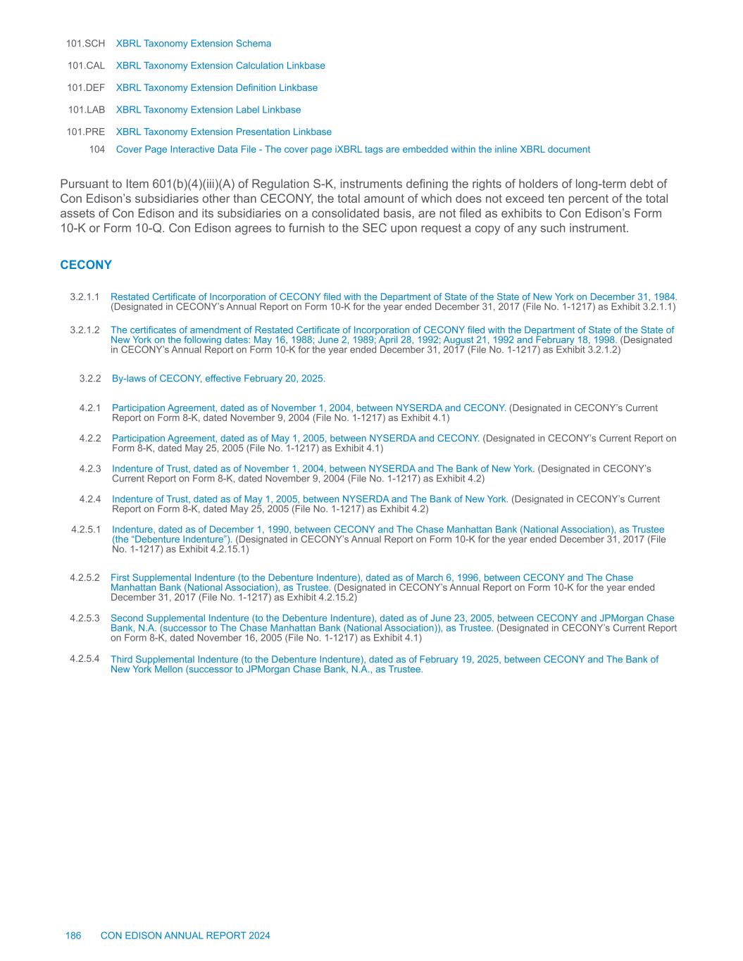 101.SCH XBRL Taxonomy Extension Schema 101.CAL XBRL Taxonomy Extension Calculation Linkbase 101.DEF XBRL Taxonomy Extension Definition Linkbase 101.LAB XBRL Taxonomy Extension Label Linkbase 101.PRE XBRL Taxonomy Extension Presentation Linkbase 104 Cover Page Interactive Data File - The cover page iXBRL tags are embedded within the inline XBRL document Pursuant to Item 601(b)(4)(iii)(A) of Regulation S-K, instruments defining the rights of holders of long-term debt of Con Edison’s subsidiaries other than CECONY, the total amount of which does not exceed ten percent of the total assets of Con Edison and its subsidiaries on a consolidated basis, are not filed as exhibits to Con Edison’s Form 10-K or Form 10-Q. Con Edison agrees to furnish to the SEC upon request a copy of any such instrument. CECONY 3.2.1.1 Restated Certificate of Incorporation of CECONY filed with the Department of State of the State of New York on December 31, 1984. (Designated in CECONY’s Annual Report on Form 10-K for the year ended December 31, 2017 (File No. 1-1217) as Exhibit 3.2.1.1) 3.2.1.2 The certificates of amendment of Restated Certificate of Incorporation of CECONY filed with the Department of State of the State of New York on the following dates: May 16, 1988; June 2, 1989; April 28, 1992; August 21, 1992 and February 18, 1998. (Designated in CECONY’s Annual Report on Form 10-K for the year ended December 31, 2017 (File No. 1-1217) as Exhibit 3.2.1.2) 3.2.2 By-laws of CECONY, effective February 20, 2025. 4.2.1 Participation Agreement, dated as of November 1, 2004, between NYSERDA and CECONY. (Designated in CECONY’s Current Report on Form 8-K, dated November 9, 2004 (File No. 1-1217) as Exhibit 4.1) 4.2.2 Participation Agreement, dated as of May 1, 2005, between NYSERDA and CECONY. (Designated in CECONY’s Current Report on Form 8-K, dated May 25, 2005 (File No. 1-1217) as Exhibit 4.1) 4.2.3 Indenture of Trust, dated as of November 1, 2004, between NYSERDA and The Bank of New York. (Designated in CECONY’s Current Report on Form 8-K, dated November 9, 2004 (File No. 1-1217) as Exhibit 4.2) 4.2.4 Indenture of Trust, dated as of May 1, 2005, between NYSERDA and The Bank of New York. (Designated in CECONY’s Current Report on Form 8-K, dated May 25, 2005 (File No. 1-1217) as Exhibit 4.2) 4.2.5.1 Indenture, dated as of December 1, 1990, between CECONY and The Chase Manhattan Bank (National Association), as Trustee (the “Debenture Indenture”). (Designated in CECONY’s Annual Report on Form 10-K for the year ended December 31, 2017 (File No. 1-1217) as Exhibit 4.2.15.1) 4.2.5.2 First Supplemental Indenture (to the Debenture Indenture), dated as of March 6, 1996, between CECONY and The Chase Manhattan Bank (National Association), as Trustee. (Designated in CECONY’s Annual Report on Form 10-K for the year ended December 31, 2017 (File No. 1-1217) as Exhibit 4.2.15.2) 4.2.5.3 Second Supplemental Indenture (to the Debenture Indenture), dated as of June 23, 2005, between CECONY and JPMorgan Chase Bank, N.A. (successor to The Chase Manhattan Bank (National Association)), as Trustee. (Designated in CECONY’s Current Report on Form 8-K, dated November 16, 2005 (File No. 1-1217) as Exhibit 4.1) 4.2.5.4 Third Supplemental Indenture (to the Debenture Indenture), dated as of February 19, 2025, between CECONY and The Bank of New York Mellon (successor to JPMorgan Chase Bank, N.A., as Trustee. 186 CON EDISON ANNUAL REPORT 2024