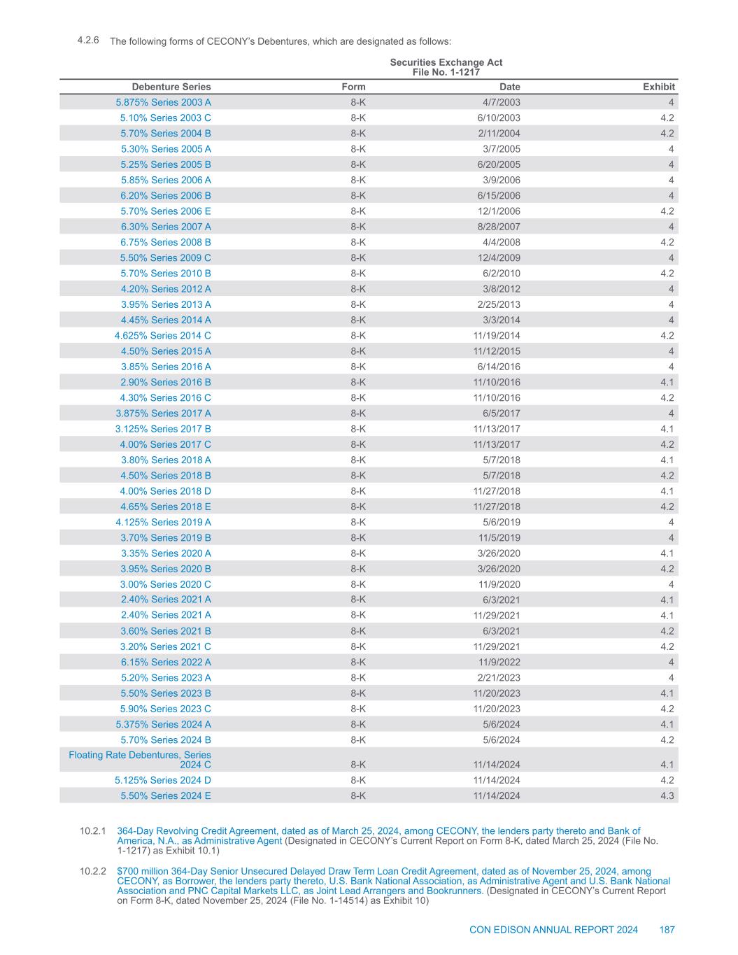 4.2.6 The following forms of CECONY’s Debentures, which are designated as follows: Securities Exchange Act File No. 1-1217 Debenture Series Form Date Exhibit 5.875% Series 2003 A 8-K 4/7/2003 4 5.10% Series 2003 C 8-K 6/10/2003 4.2 5.70% Series 2004 B 8-K 2/11/2004 4.2 5.30% Series 2005 A 8-K 3/7/2005 4 5.25% Series 2005 B 8-K 6/20/2005 4 5.85% Series 2006 A 8-K 3/9/2006 4 6.20% Series 2006 B 8-K 6/15/2006 4 5.70% Series 2006 E 8-K 12/1/2006 4.2 6.30% Series 2007 A 8-K 8/28/2007 4 6.75% Series 2008 B 8-K 4/4/2008 4.2 5.50% Series 2009 C 8-K 12/4/2009 4 5.70% Series 2010 B 8-K 6/2/2010 4.2 4.20% Series 2012 A 8-K 3/8/2012 4 3.95% Series 2013 A 8-K 2/25/2013 4 4.45% Series 2014 A 8-K 3/3/2014 4 4.625% Series 2014 C 8-K 11/19/2014 4.2 4.50% Series 2015 A 8-K 11/12/2015 4 3.85% Series 2016 A 8-K 6/14/2016 4 2.90% Series 2016 B 8-K 11/10/2016 4.1 4.30% Series 2016 C 8-K 11/10/2016 4.2 3.875% Series 2017 A 8-K 6/5/2017 4 3.125% Series 2017 B 8-K 11/13/2017 4.1 4.00% Series 2017 C 8-K 11/13/2017 4.2 3.80% Series 2018 A 8-K 5/7/2018 4.1 4.50% Series 2018 B 8-K 5/7/2018 4.2 4.00% Series 2018 D 8-K 11/27/2018 4.1 4.65% Series 2018 E 8-K 11/27/2018 4.2 4.125% Series 2019 A 8-K 5/6/2019 4 3.70% Series 2019 B 8-K 11/5/2019 4 3.35% Series 2020 A 8-K 3/26/2020 4.1 3.95% Series 2020 B 8-K 3/26/2020 4.2 3.00% Series 2020 C 8-K 11/9/2020 4 2.40% Series 2021 A 8-K 6/3/2021 4.1 2.40% Series 2021 A 8-K 11/29/2021 4.1 3.60% Series 2021 B 8-K 6/3/2021 4.2 3.20% Series 2021 C 8-K 11/29/2021 4.2 6.15% Series 2022 A 8-K 11/9/2022 4 5.20% Series 2023 A 8-K 2/21/2023 4 5.50% Series 2023 B 8-K 11/20/2023 4.1 5.90% Series 2023 C 8-K 11/20/2023 4.2 5.375% Series 2024 A 8-K 5/6/2024 4.1 5.70% Series 2024 B 8-K 5/6/2024 4.2 Floating Rate Debentures, Series 2024 C 8-K 11/14/2024 4.1 5.125% Series 2024 D 8-K 11/14/2024 4.2 5.50% Series 2024 E 8-K 11/14/2024 4.3 10.2.1 364-Day Revolving Credit Agreement, dated as of March 25, 2024, among CECONY, the lenders party thereto and Bank of America, N.A., as Administrative Agent (Designated in CECONY’s Current Report on Form 8-K, dated March 25, 2024 (File No. 1-1217) as Exhibit 10.1) 10.2.2 $700 million 364-Day Senior Unsecured Delayed Draw Term Loan Credit Agreement, dated as of November 25, 2024, among CECONY, as Borrower, the lenders party thereto, U.S. Bank National Association, as Administrative Agent and U.S. Bank National Association and PNC Capital Markets LLC, as Joint Lead Arrangers and Bookrunners. (Designated in CECONY’s Current Report on Form 8-K, dated November 25, 2024 (File No. 1-14514) as Exhibit 10) CON EDISON ANNUAL REPORT 2024 187