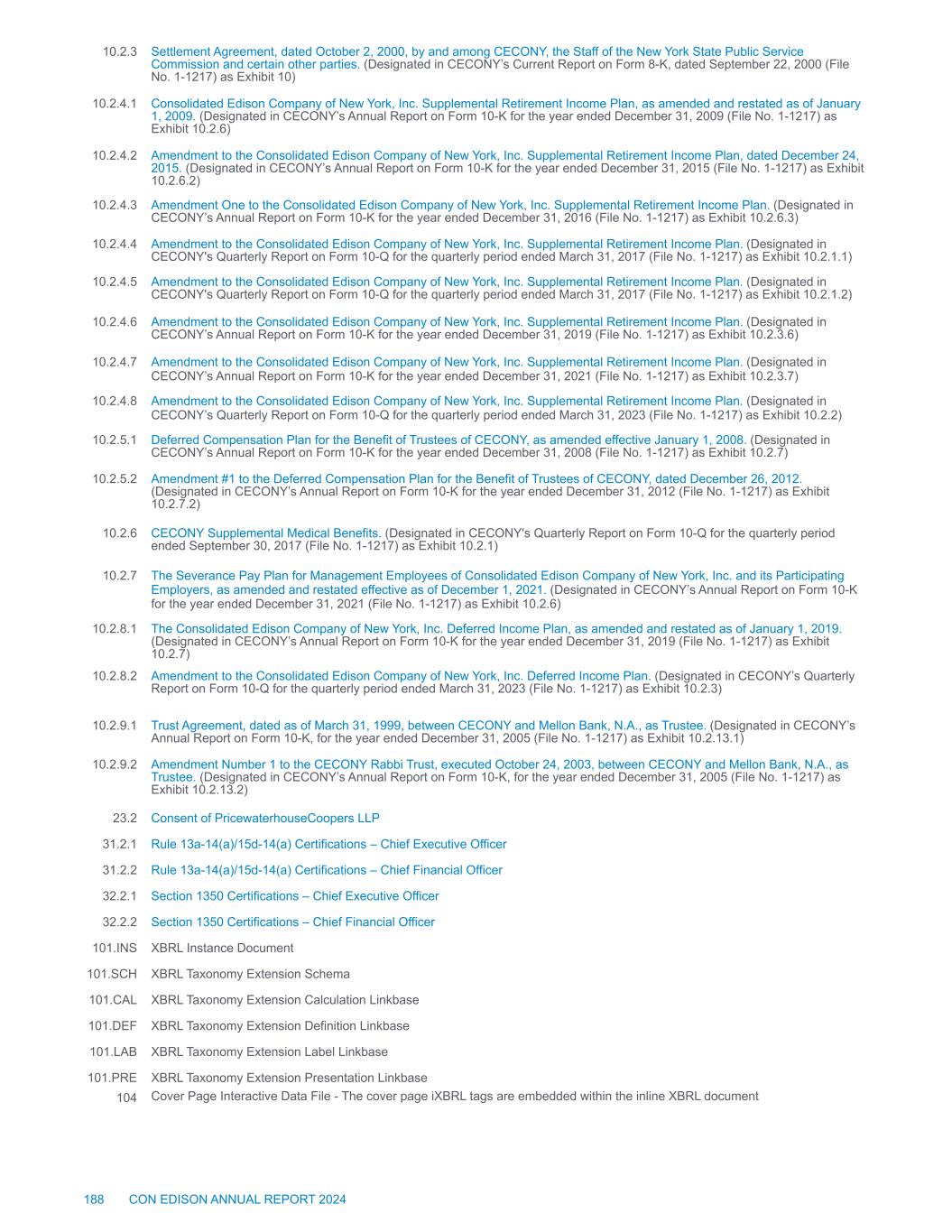 10.2.3 Settlement Agreement, dated October 2, 2000, by and among CECONY, the Staff of the New York State Public Service Commission and certain other parties. (Designated in CECONY’s Current Report on Form 8-K, dated September 22, 2000 (File No. 1-1217) as Exhibit 10) 10.2.4.1 Consolidated Edison Company of New York, Inc. Supplemental Retirement Income Plan, as amended and restated as of January 1, 2009. (Designated in CECONY’s Annual Report on Form 10-K for the year ended December 31, 2009 (File No. 1-1217) as Exhibit 10.2.6) 10.2.4.2 Amendment to the Consolidated Edison Company of New York, Inc. Supplemental Retirement Income Plan, dated December 24, 2015. (Designated in CECONY’s Annual Report on Form 10-K for the year ended December 31, 2015 (File No. 1-1217) as Exhibit 10.2.6.2) 10.2.4.3 Amendment One to the Consolidated Edison Company of New York, Inc. Supplemental Retirement Income Plan. (Designated in CECONY’s Annual Report on Form 10-K for the year ended December 31, 2016 (File No. 1-1217) as Exhibit 10.2.6.3) 10.2.4.4 Amendment to the Consolidated Edison Company of New York, Inc. Supplemental Retirement Income Plan. (Designated in CECONY's Quarterly Report on Form 10-Q for the quarterly period ended March 31, 2017 (File No. 1-1217) as Exhibit 10.2.1.1) 10.2.4.5 Amendment to the Consolidated Edison Company of New York, Inc. Supplemental Retirement Income Plan. (Designated in CECONY's Quarterly Report on Form 10-Q for the quarterly period ended March 31, 2017 (File No. 1-1217) as Exhibit 10.2.1.2) 10.2.4.6 Amendment to the Consolidated Edison Company of New York, Inc. Supplemental Retirement Income Plan. (Designated in CECONY’s Annual Report on Form 10-K for the year ended December 31, 2019 (File No. 1-1217) as Exhibit 10.2.3.6) 10.2.4.7 Amendment to the Consolidated Edison Company of New York, Inc. Supplemental Retirement Income Plan. (Designated in CECONY’s Annual Report on Form 10-K for the year ended December 31, 2021 (File No. 1-1217) as Exhibit 10.2.3.7) 10.2.4.8 Amendment to the Consolidated Edison Company of New York, Inc. Supplemental Retirement Income Plan. (Designated in CECONY’s Quarterly Report on Form 10-Q for the quarterly period ended March 31, 2023 (File No. 1-1217) as Exhibit 10.2.2) 10.2.5.1 Deferred Compensation Plan for the Benefit of Trustees of CECONY, as amended effective January 1, 2008. (Designated in CECONY’s Annual Report on Form 10-K for the year ended December 31, 2008 (File No. 1-1217) as Exhibit 10.2.7) 10.2.5.2 Amendment #1 to the Deferred Compensation Plan for the Benefit of Trustees of CECONY, dated December 26, 2012. (Designated in CECONY’s Annual Report on Form 10-K for the year ended December 31, 2012 (File No. 1-1217) as Exhibit 10.2.7.2) 10.2.6 CECONY Supplemental Medical Benefits. (Designated in CECONY's Quarterly Report on Form 10-Q for the quarterly period ended September 30, 2017 (File No. 1-1217) as Exhibit 10.2.1) 10.2.7 The Severance Pay Plan for Management Employees of Consolidated Edison Company of New York, Inc. and its Participating Employers, as amended and restated effective as of December 1, 2021. (Designated in CECONY’s Annual Report on Form 10-K for the year ended December 31, 2021 (File No. 1-1217) as Exhibit 10.2.6) 10.2.8.1 The Consolidated Edison Company of New York, Inc. Deferred Income Plan, as amended and restated as of January 1, 2019. (Designated in CECONY’s Annual Report on Form 10-K for the year ended December 31, 2019 (File No. 1-1217) as Exhibit 10.2.7) 10.2.8.2 Amendment to the Consolidated Edison Company of New York, Inc. Deferred Income Plan. (Designated in CECONY’s Quarterly Report on Form 10-Q for the quarterly period ended March 31, 2023 (File No. 1-1217) as Exhibit 10.2.3) 10.2.9.1 Trust Agreement, dated as of March 31, 1999, between CECONY and Mellon Bank, N.A., as Trustee. (Designated in CECONY’s Annual Report on Form 10-K, for the year ended December 31, 2005 (File No. 1-1217) as Exhibit 10.2.13.1) 10.2.9.2 Amendment Number 1 to the CECONY Rabbi Trust, executed October 24, 2003, between CECONY and Mellon Bank, N.A., as Trustee. (Designated in CECONY’s Annual Report on Form 10-K, for the year ended December 31, 2005 (File No. 1-1217) as Exhibit 10.2.13.2) 23.2 Consent of PricewaterhouseCoopers LLP 31.2.1 Rule 13a-14(a)/15d-14(a) Certifications – Chief Executive Officer 31.2.2 Rule 13a-14(a)/15d-14(a) Certifications – Chief Financial Officer 32.2.1 Section 1350 Certifications – Chief Executive Officer 32.2.2 Section 1350 Certifications – Chief Financial Officer 101.INS XBRL Instance Document 101.SCH XBRL Taxonomy Extension Schema 101.CAL XBRL Taxonomy Extension Calculation Linkbase 101.DEF XBRL Taxonomy Extension Definition Linkbase 101.LAB XBRL Taxonomy Extension Label Linkbase 101.PRE XBRL Taxonomy Extension Presentation Linkbase 104 Cover Page Interactive Data File - The cover page iXBRL tags are embedded within the inline XBRL document 188 CON EDISON ANNUAL REPORT 2024