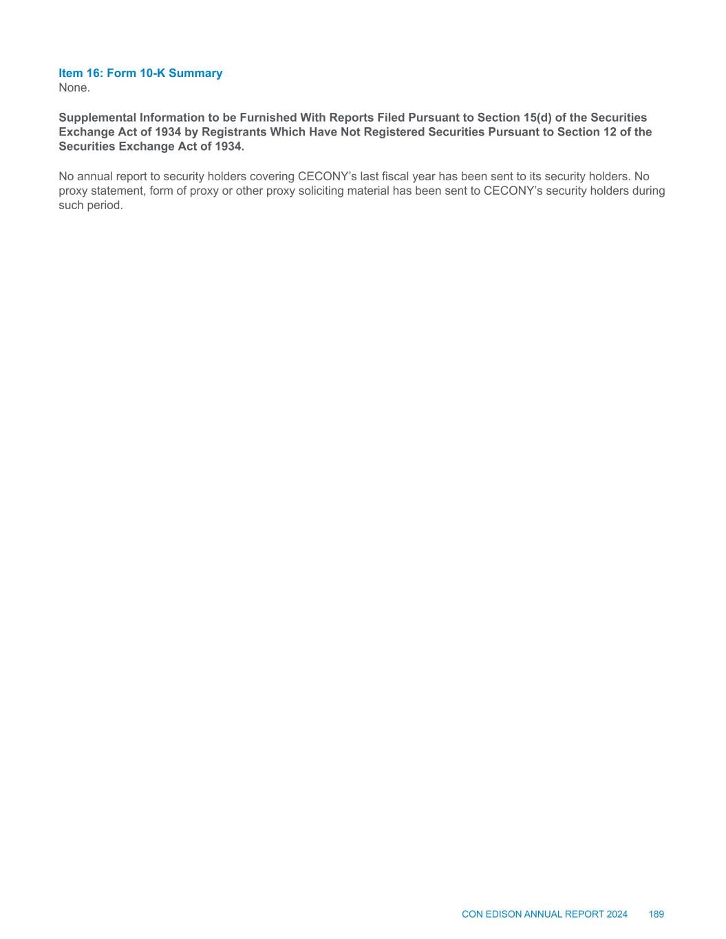 Item 16: Form 10-K Summary None. Supplemental Information to be Furnished With Reports Filed Pursuant to Section 15(d) of the Securities Exchange Act of 1934 by Registrants Which Have Not Registered Securities Pursuant to Section 12 of the Securities Exchange Act of 1934. No annual report to security holders covering CECONY’s last fiscal year has been sent to its security holders. No proxy statement, form of proxy or other proxy soliciting material has been sent to CECONY’s security holders during such period. CON EDISON ANNUAL REPORT 2024 189