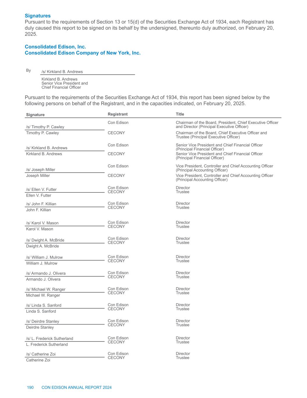 Signatures Pursuant to the requirements of Section 13 or 15(d) of the Securities Exchange Act of 1934, each Registrant has duly caused this report to be signed on its behalf by the undersigned, thereunto duly authorized, on February 20, 2025. Consolidated Edison, Inc. Consolidated Edison Company of New York, Inc. By /s/ Kirkland B. Andrews Kirkland B. Andrews Senior Vice President and Chief Financial Officer Pursuant to the requirements of the Securities Exchange Act of 1934, this report has been signed below by the following persons on behalf of the Registrant, and in the capacities indicated, on February 20, 2025. Signature Registrant Title /s/ Timothy P. Cawley Con Edison Chairman of the Board, President, Chief Executive Officer and Director (Principal Executive Officer) Timothy P. Cawley CECONY Chairman of the Board, Chief Executive Officer and Trustee (Principal Executive Officer) /s/ Kirkland B. Andrews Con Edison Senior Vice President and Chief Financial Officer (Principal Financial Officer) Kirkland B. Andrews CECONY Senior Vice President and Chief Financial Officer (Principal Financial Officer) /s/ Joseph Miller Con Edison Vice President, Controller and Chief Accounting Officer (Principal Accounting Officer) Joseph Miller CECONY Vice President, Controller and Chief Accounting Officer (Principal Accounting Officer) /s/ Ellen V. Futter Con Edison CECONY Director Trustee Ellen V. Futter /s/ John F. Killian Con Edison CECONY Director TrusteeJohn F. Killian /s/ Karol V. Mason Con Edison CECONY Director TrusteeKarol V. Mason /s/ Dwight A. McBride Con Edison CECONY Director Trustee Dwight A. McBride /s/ William J. Mulrow Con Edison CECONY Director TrusteeWilliam J. Mulrow /s/ Armando J. Olivera Con Edison CECONY Director TrusteeArmando J. Olivera /s/ Michael W. Ranger Con Edison CECONY Director TrusteeMichael W. Ranger /s/ Linda S. Sanford Con Edison CECONY Director TrusteeLinda S. Sanford /s/ Deirdre Stanley Con Edison CECONY Director TrusteeDeirdre Stanley /s/ L. Frederick Sutherland Con Edison CECONY Director TrusteeL. Frederick Sutherland /s/ Catherine Zoi Con Edison CECONY Director TrusteeCatherine Zoi 190 CON EDISON ANNUAL REPORT 2024