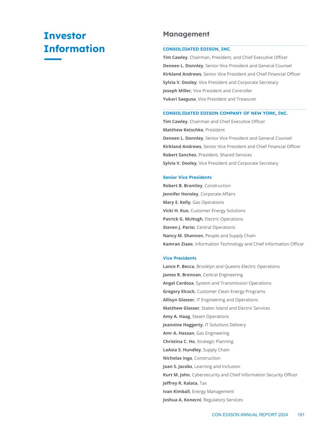 Annual Report-2024_PRESS.indd 12 3/11/25 12:11 PM CON EDISON ANNUAL REPORT 2024 191 Management CONSOLIDATED EDISON, INC. Tim Cawley, Chairman, President, and Chief Executive Officer Deneen L. Donnley, Senior Vice President and General Counsel Kirkland Andrews, Senior Vice President and Chief Financial Officer Sylvia V. Dooley, Vice President and Corporate Secretary Joseph Miller, Vice President and Controller Yukari Saegusa, Vice President and Treasurer CONSOLIDATED EDISON COMPANY OF NEW YORK, INC. Tim Cawley, Chairman and Chief Executive Officer Matthew Ketschke, President Deneen L. Donnley, Senior Vice President and General Counsel Kirkland Andrews, Senior Vice President and Chief Financial Officer Robert Sanchez, President, Shared Services Sylvia V. Dooley, Vice President and Corporate Secretary Senior Vice Presidents Robert B. Brantley, Construction Jennifer Hensley, Corporate Affairs Mary E. Kelly, Gas Operations Vicki H. Kuo, Customer Energy Solutions Patrick G. McHugh, Electric Operations Steven J. Parisi, Central Operations Nancy M. Shannon, People and Supply Chain Kamran Ziaee, Information Technology and Chief Information Officer Vice Presidents Lance P. Becca, Brooklyn and Queens Electric Operations James R. Brennan, Central Engineering Angel Cardoza, System and Transmission Operations Gregory Elcock, Customer Clean Energy Programs Allisyn Glasser, IT Engineering and Operations Matthew Glasser, Staten Island and Electric Services Amy A. Haag, Steam Operations Jeannine Haggerty, IT Solutions Delivery Amr A. Hassan, Gas Engineering Christina C. Ho, Strategic Planning LaAsia S. Hundley, Supply Chain Nicholas Inga, Construction Joan S. Jacobs, Learning and Inclusion Kurt M. John, Cybersecurity and Chief Information Security Officer Jeffrey R. Kalata, Tax Ivan Kimball, Energy Management Joshua A. Konecni, Regulatory Services Investor Information