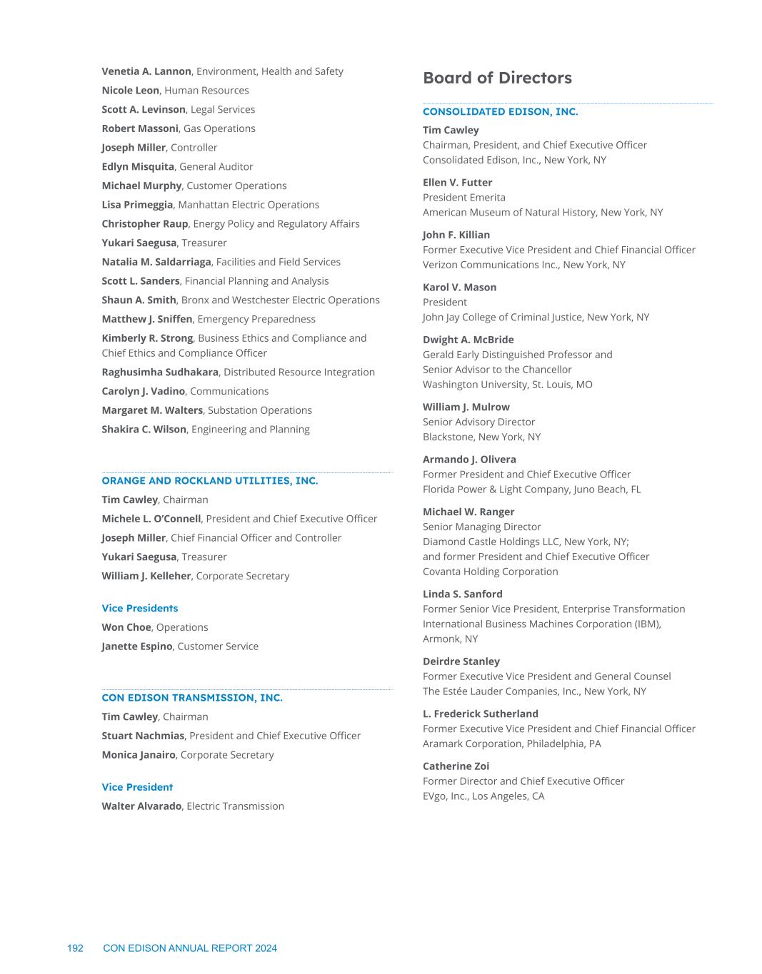 Management CONSOLIDATED EDISON, INC. Tim Cawley, Chairman, President, and Chief Executive Officer Deneen L. Donnley, Senior Vice President and General Counsel Kirkland Andrews, Senior Vice President and Chief Financial Officer Sylvia V. Dooley, Vice President and Corporate Secretary Joseph Miller, Vice President and Controller Yukari Saegusa, Vice President and Treasurer CONSOLIDATED EDISON COMPANY OF NEW YORK, INC. Tim Cawley, Chairman and Chief Executive Officer Matthew Ketschke, President Deneen L. Donnley, Senior Vice President and General Counsel Kirkland Andrews, Senior Vice President and Chief Financial Officer Robert Sanchez, President, Shared Services Sylvia V. Dooley, Vice President and Corporate Secretary Senior Vice Presidents Robert B. Brantley, Construction Jennifer Hensley, Corporate Affairs Mary E. Kelly, Gas Operations Vicki H. Kuo, Customer Energy Solutions Patrick G. McHugh, Electric Operations Steven J. Parisi, Central Operations Nancy M. Shannon, People and Supply Chain Kamran Ziaee, Information Technology and Chief Information Officer Vice Presidents Lance P. Becca, Brooklyn and Queens Electric Operations James R. Brennan, Central Engineering Angel Cardoza, System and Transmission Operations Gregory Elcock, Customer Clean Energy Programs Allisyn Glasser, IT Engineering and Operations Matthew Glasser, Staten Island and Electric Services Amy A. Haag, Steam Operations Jeannine Haggerty, IT Solutions Delivery Amr A. Hassan, Gas Engineering Christina C. Ho, Strategic Planning LaAsia S. Hundley, Supply Chain Nicholas Inga, Construction Joan S. Jacobs, Learning and Inclusion Kurt M. John, Cybersecurity and Chief Information Security Officer Jeffrey R. Kalata, Tax Ivan Kimball, Energy Management Joshua A. Konecni, Regulatory Services Annual Report-2024_PRESS.indd 13 3/11/25 12:11 PM 192 CON EDISON ANNUAL REPORT 2024 Venetia A. Lannon, Environment, Health and Safety Nicole Leon, Human Resources Scott A. Levinson, Legal Services Robert Massoni, Gas Operations Joseph Miller, Controller Edlyn Misquita, General Auditor Michael Murphy, Customer Operations Lisa Primeggia, Manhattan Electric Operations Christopher Raup, Energy Policy and Regulatory Affairs Yukari Saegusa, Treasurer Natalia M. Saldarriaga, Facilities and Field Services Scott L. Sanders, Financial Planning and Analysis Shaun A. Smith, Bronx and Westchester Electric Operations Matthew J. Sniffen, Emergency Preparedness Kimberly R. Strong, Business Ethics and Compliance and Chief Ethics and Compliance Officer Raghusimha Sudhakara, Distributed Resource Integration Carolyn J. Vadino, Communications Margaret M. Walters, Substation Operations Shakira C. Wilson, Engineering and Planning ORANGE AND ROCKLAND UTILITIES, INC. Tim Cawley, Chairman Michele L. O’Connell, President and Chief Executive Officer Joseph Miller, Chief Financial Officer and Controller Yukari Saegusa, Treasurer William J. Kelleher, Corporate Secretary Vice Presidents Won Choe, Operations Janette Espino, Customer Service CON EDISON TRANSMISSION, INC. Tim Cawley, Chairman Stuart Nachmias, President and Chief Executive Officer Monica Janairo, Corporate Secretary Vice President Walter Alvarado, Electric Transmission Board of Directors CONSOLIDATED EDISON, INC. Tim Cawley Chairman, President, and Chief Executive Officer Consolidated Edison, Inc., New York, NY Ellen V. Futter President Emerita American Museum of Natural History, New York, NY John F. Killian Former Executive Vice President and Chief Financial Officer Verizon Communications Inc., New York, NY Karol V. Mason President John Jay College of Criminal Justice, New York, NY Dwight A. McBride Gerald Early Distinguished Professor and Senior Advisor to the Chancellor Washington University, St. Louis, MO William J. Mulrow Senior Advisory Director Blackstone, New York, NY Armando J. Olivera Former President and Chief Executive Officer Florida Power & Light Company, Juno Beach, FL Michael W. Ranger Senior Managing Director Diamond Castle Holdings LLC, New York, NY; and former President and Chief Executive Officer Covanta Holding Corporation Linda S. Sanford Former Senior Vice President, Enterprise Transformation International Business Machines Corporation (IBM), Armonk, NY Deirdre Stanley Former Executive Vice President and General Counsel The Estée Lauder Companies, Inc., New York, NY L. Frederick Sutherland Former Executive Vice President and Chief Financial Officer Aramark Corporation, Philadelphia, PA Catherine Zoi Former Director and Chief Executive Officer EVgo, Inc., Los Angeles, CA