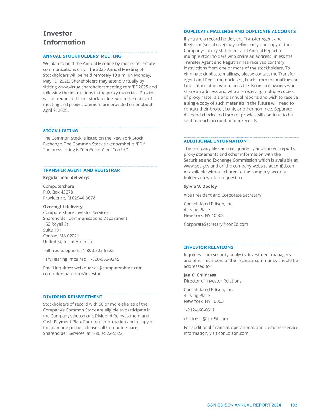 Annual Report-2024_PRESS.indd 14 3/11/25 12:11 PM CON EDISON ANNUAL REPORT 2024 193 Investor Information ANNUAL STOCKHOLDERS’ MEETING We plan to hold the Annual Meeting by means of remote communications only. The 2025 Annual Meeting of Stockholders will be held remotely 10 a.m. on Monday, May 19, 2025. Shareholders may attend virtually by visiting www.virtualshareholdermeeting.com/ED2025 and following the instructions in the proxy materials. Proxies will be requested from stockholders when the notice of meeting and proxy statement are provided on or about April 9, 2025. STOCK LISTING The Common Stock is listed on the New York Stock Exchange. The Common Stock ticker symbol is “ED.” The press listing is “ConEdison” or “ConEd.” TRANSFER AGENT AND REGISTRAR Regular mail delivery: Computershare P.O. Box 43078 Providence, RI 02940-3078 Overnight delivery: Computershare Investor Services Shareholder Communications Department 150 Royall St Suite 101 Canton, MA 02021 United States of America Toll-free telephone: 1-800-522-5522 TTY/Hearing Impaired: 1-800-952-9245 Email inquiries: web.queries@computershare.com computershare.com/investor DIVIDEND REINVESTMENT Stockholders of record with 50 or more shares of the Company’s Common Stock are eligible to participate in the Company’s Automatic Dividend Reinvestment and Cash Payment Plan. For more information and a copy of the plan prospectus, please call Computershare, Shareholder Services, at 1-800-522-5522. DUPLICATE MAILINGS AND DUPLICATE ACCOUNTS If you are a record holder, the Transfer Agent and Registrar (see above) may deliver only one copy of the Company’s proxy statement and Annual Report to multiple stockholders who share an address unless the Transfer Agent and Registrar has received contrary instructions from one or more of the stockholders. To eliminate duplicate mailings, please contact the Transfer Agent and Registrar, enclosing labels from the mailings or label information where possible. Beneficial owners who share an address and who are receiving multiple copies of proxy materials and annual reports and wish to receive a single copy of such materials in the future will need to contact their broker, bank, or other nominee. Separate dividend checks and form of proxies will continue to be sent for each account on our records. ADDITIONAL INFORMATION The company files annual, quarterly and current reports, proxy statements and other information with the Securities and Exchange Commission which is available at www.sec.gov and on the company website at conEd.com or available without charge to the company security holders on written request to: Sylvia V. Dooley Vice President and Corporate Secretary Consolidated Edison, Inc. 4 Irving Place New York, NY 10003 CorporateSecretary@conEd.com INVESTOR RELATIONS Inquiries from security analysts, investment managers, and other members of the financial community should be addressed to: Jan C. Childress Director of Investor Relations Consolidated Edison, Inc. 4 Irving Place New York, NY 10003 1-212-460-6611 childressj@conEd.com For additional financial, operational, and customer service information, visit conEdison.com.
