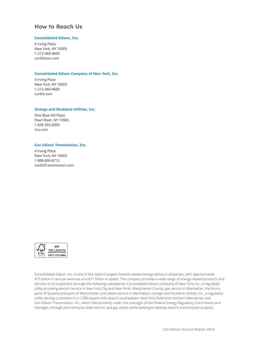 Con Edison Annual Report 2024 ECONOMY EQUITY JOBS $24.1B total economic output (1% of NYS GDP) $1.9B in contracts with NYS & NYC businesses 41K jobs generated including our own workforce in infrastructure and clean energy spending benefiting disadvantaged customers 21% 477K customers with low income receiving discounts through our Energy Affordability Program $1B higher employee retention rate than industry average OUR ECONOMIC IMPACT How to Reach Us Consolidated Edison, Inc. 4 Irving Place New York, NY 10003 1-212-460-4600 conEdison.com Consolidated Edison Company of New York, Inc. 4 Irving Place New York, NY 10003 1-212-460-4600 conEd.com Orange and Rockland Utilities, Inc. One Blue Hill Plaza Pearl River, NY 10965 1-845-352-6000 oru.com Con Edison Transmission, Inc. 4 Irving Place New York, NY 10003 1-888-800-8712 conEdTransmission.com Consolidated Edison, Inc. is one of the nation’s largest investor-owned energy-delivery companies, with approximately $15 billion in annual revenues and $71 billion in assets. The company provides a wide range of energy-related products and services to its customers through the following subsidiaries: Consolidated Edison Company of New York, Inc., a regulated utility providing electric service in New York City and New York’s Westchester County, gas service in Manhattan, the Bronx, parts of Queens and parts of Westchester, and steam service in Manhattan; Orange and Rockland Utilities, Inc., a regulated utility serving customers in a 1,300-square-mile area in southeastern New York State and northern New Jersey; and Con Edison Transmission, Inc., which falls primarily under the oversight of the Federal Energy Regulatory Commission and manages, through joint ventures, both electric and gas assets while seeking to develop electric transmission projects. 440484_Annual Report-2024_PRESS_N_CVR.indd 6 3/12/25 2:51 PM